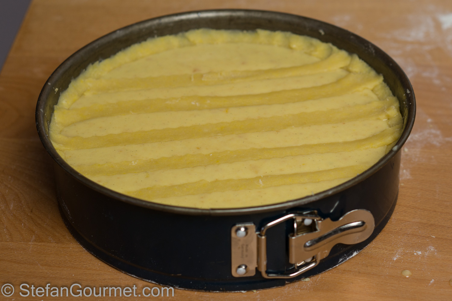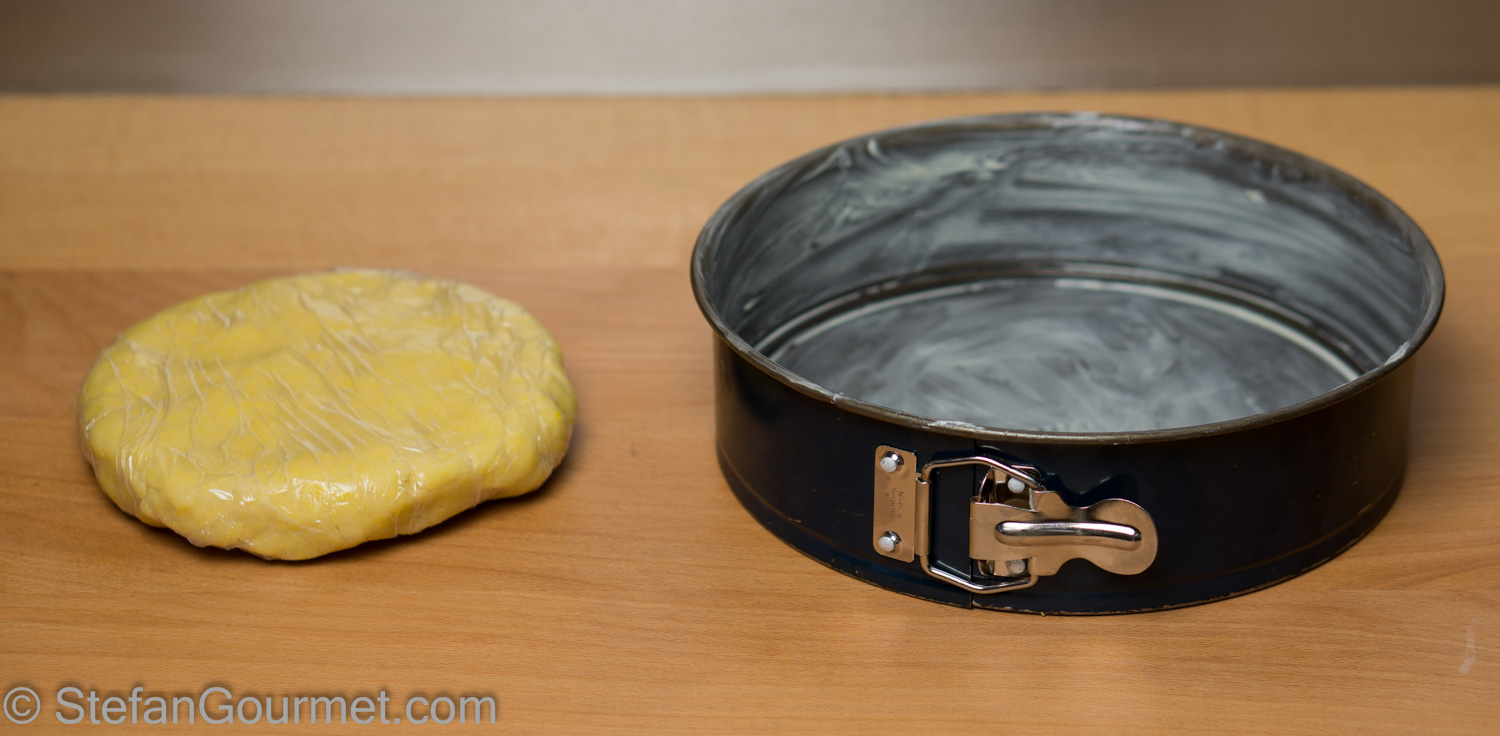 Preheat the oven to 180ºC/375ºF (or 160ºC/320ºF if fan forced). Butter a 24 cm (9″) springform pan. Take the pasta frolla out of the refrigerator.