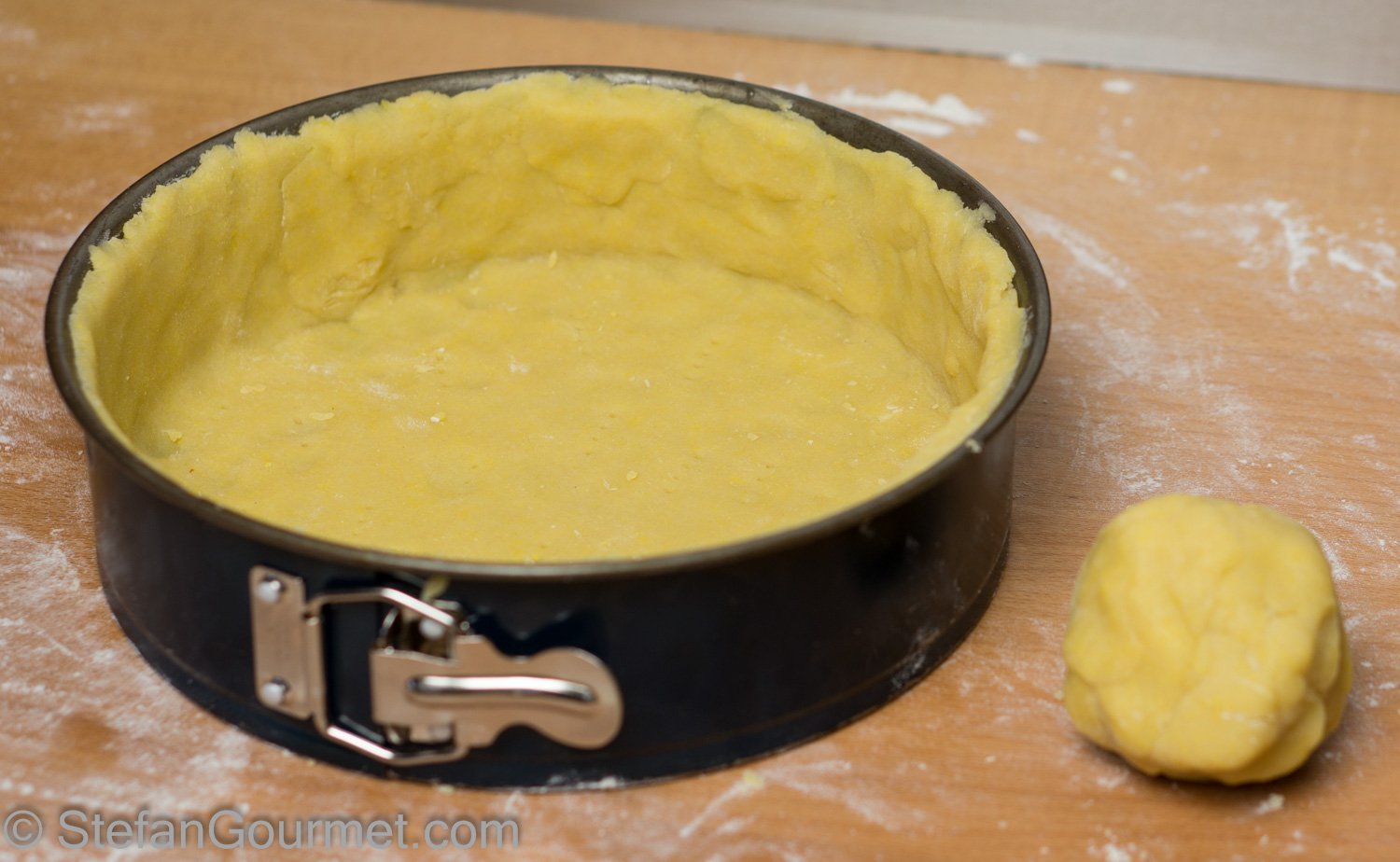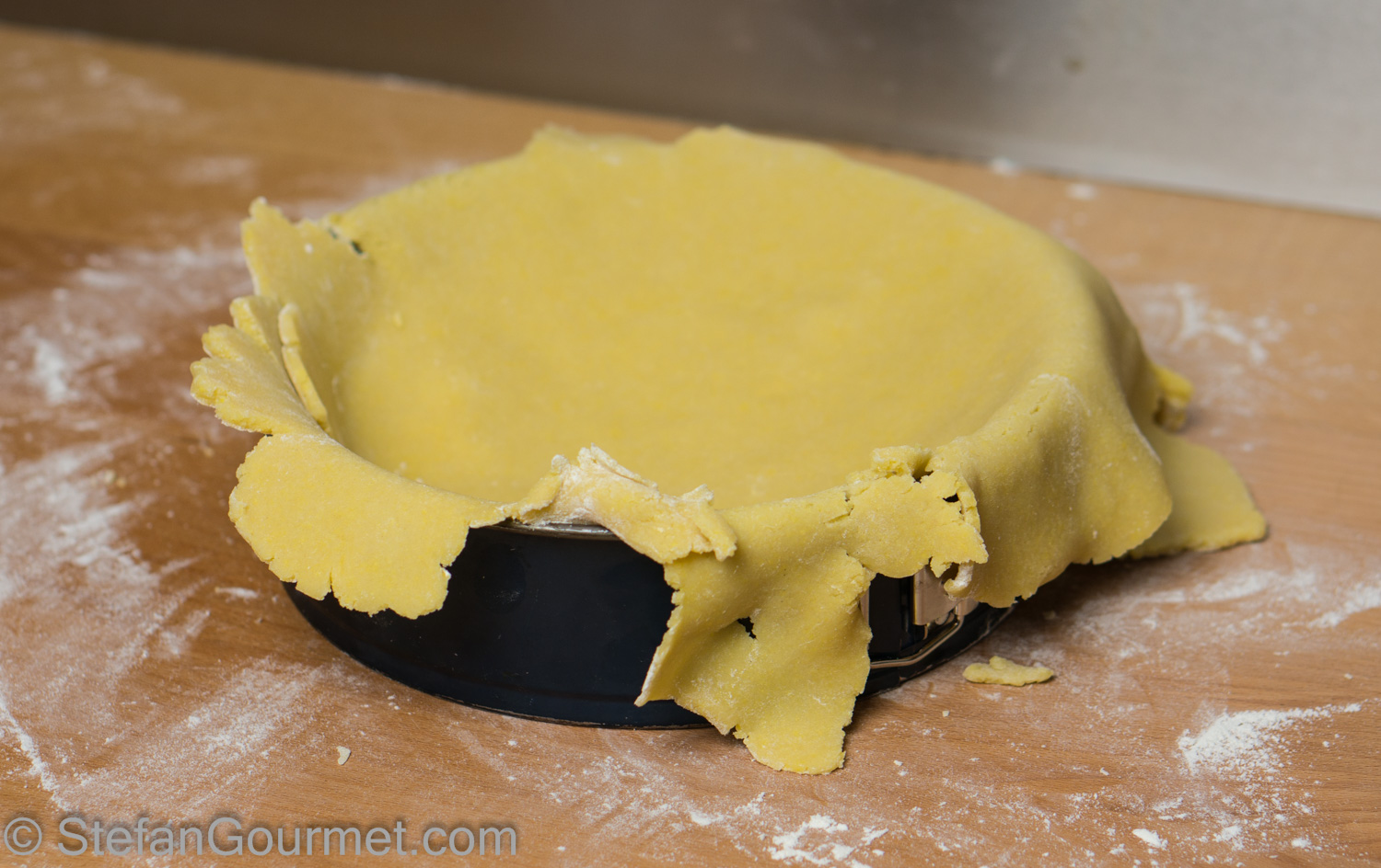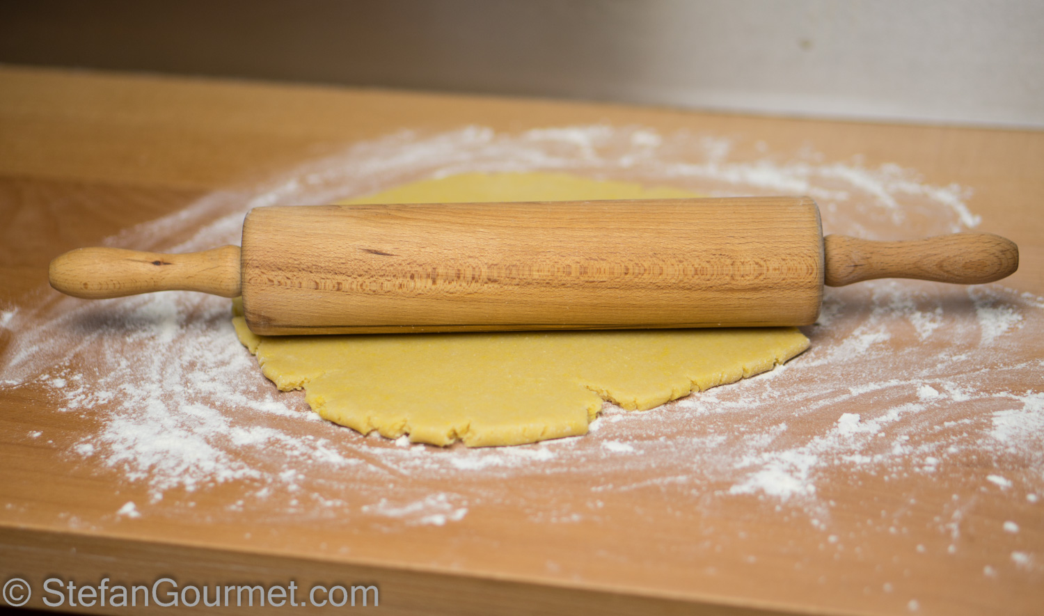 On a floured work surface, preferably wooden, roll out the shortcrust pastry such that it has an even thickness of about 3 mm (1/8 inch).
