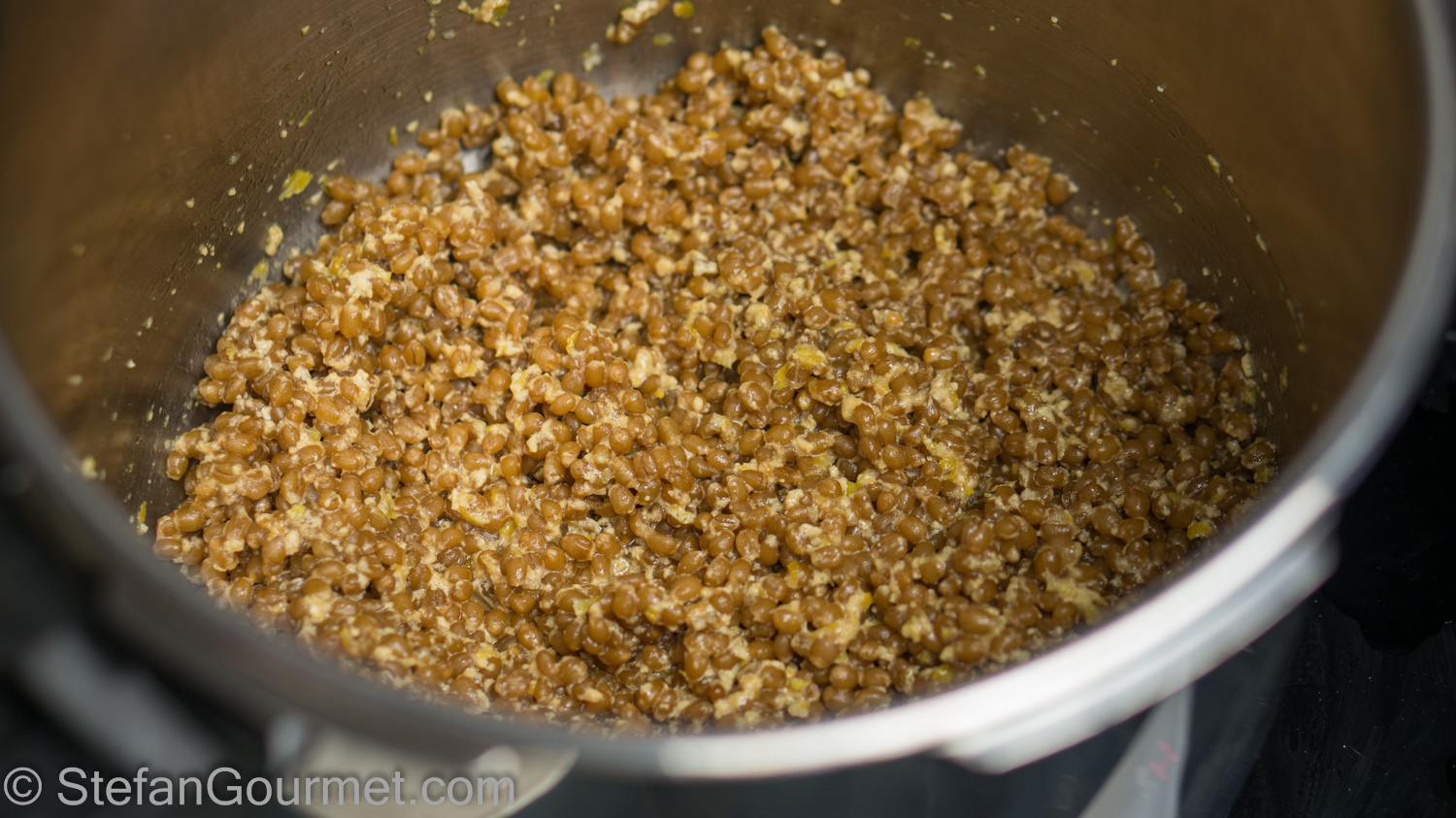 At the end of the cooking time, the wheat should be cooked al dente and the liquid should be absorbed. Simmer it longer if needed.
