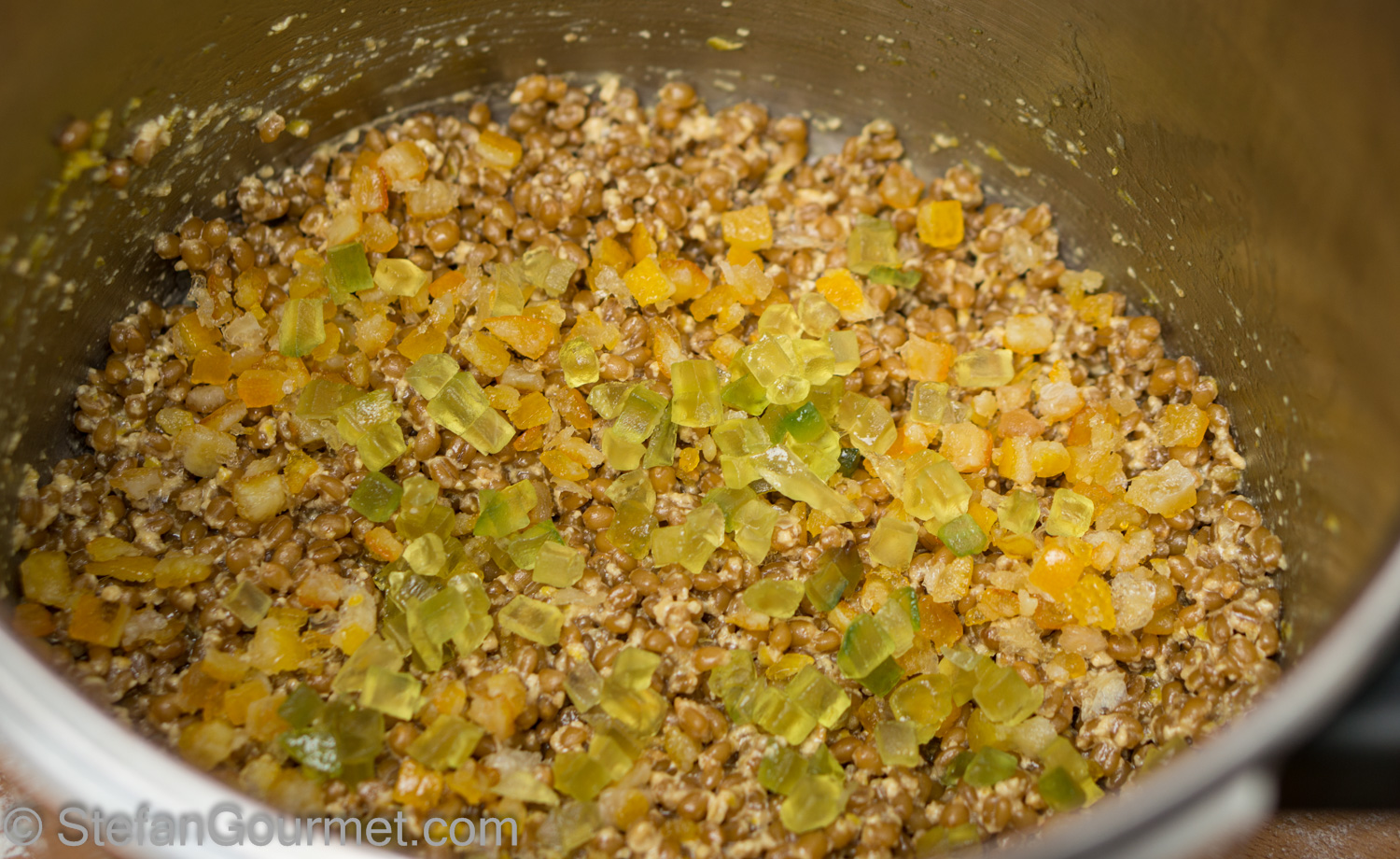 When the cooked wheat is finished and has cooled down somewhat, add the candied citron and orange.