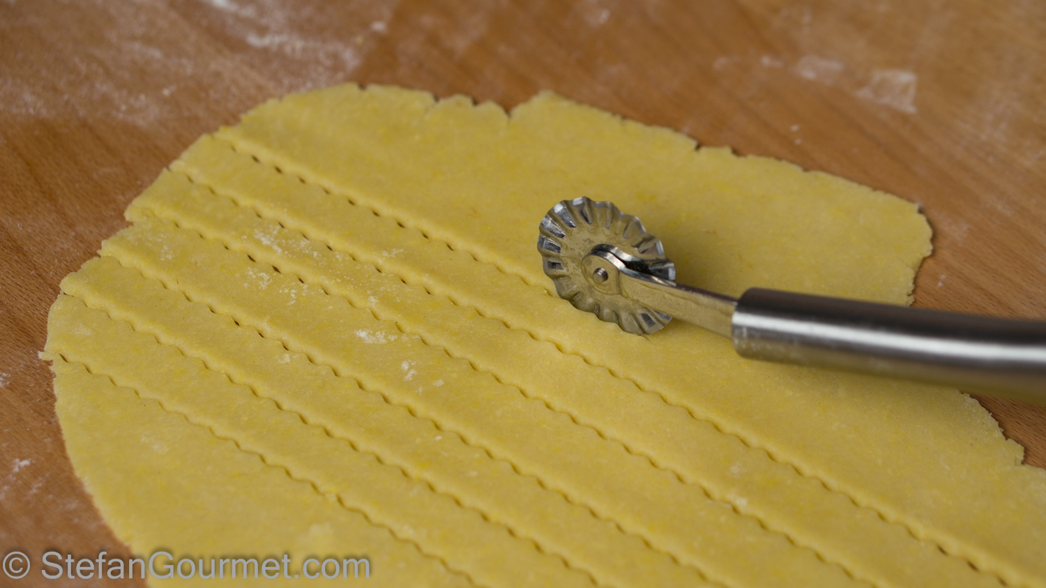 Roll out the reserved pastry and with a pastry wheel cut it into strips of about 8 mm (1/3 inch) wide.