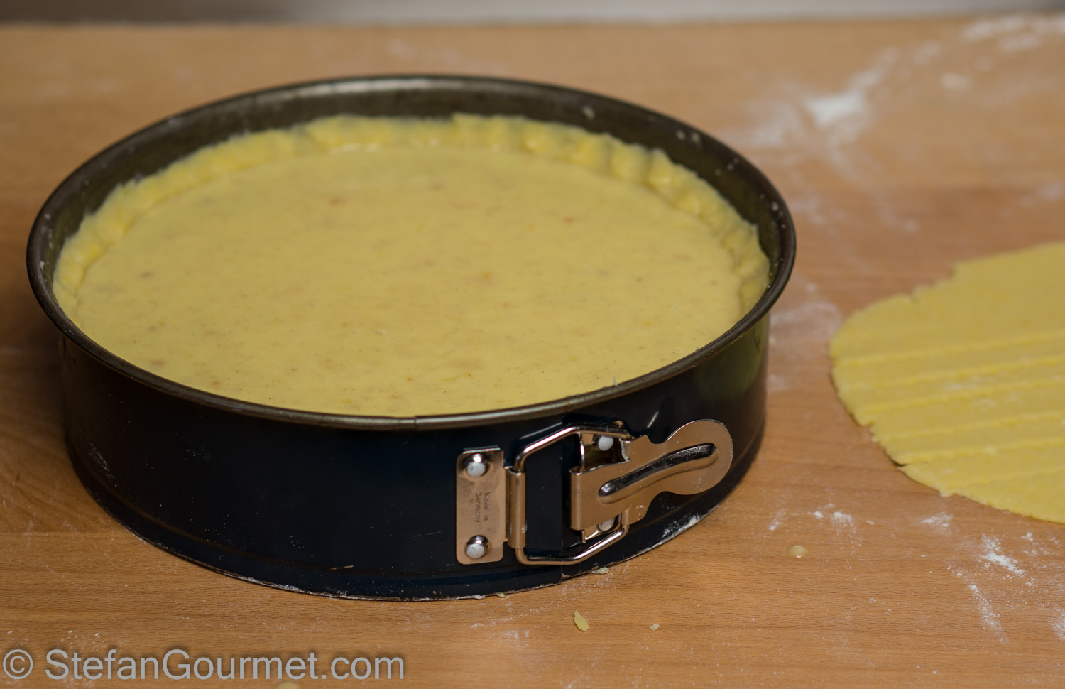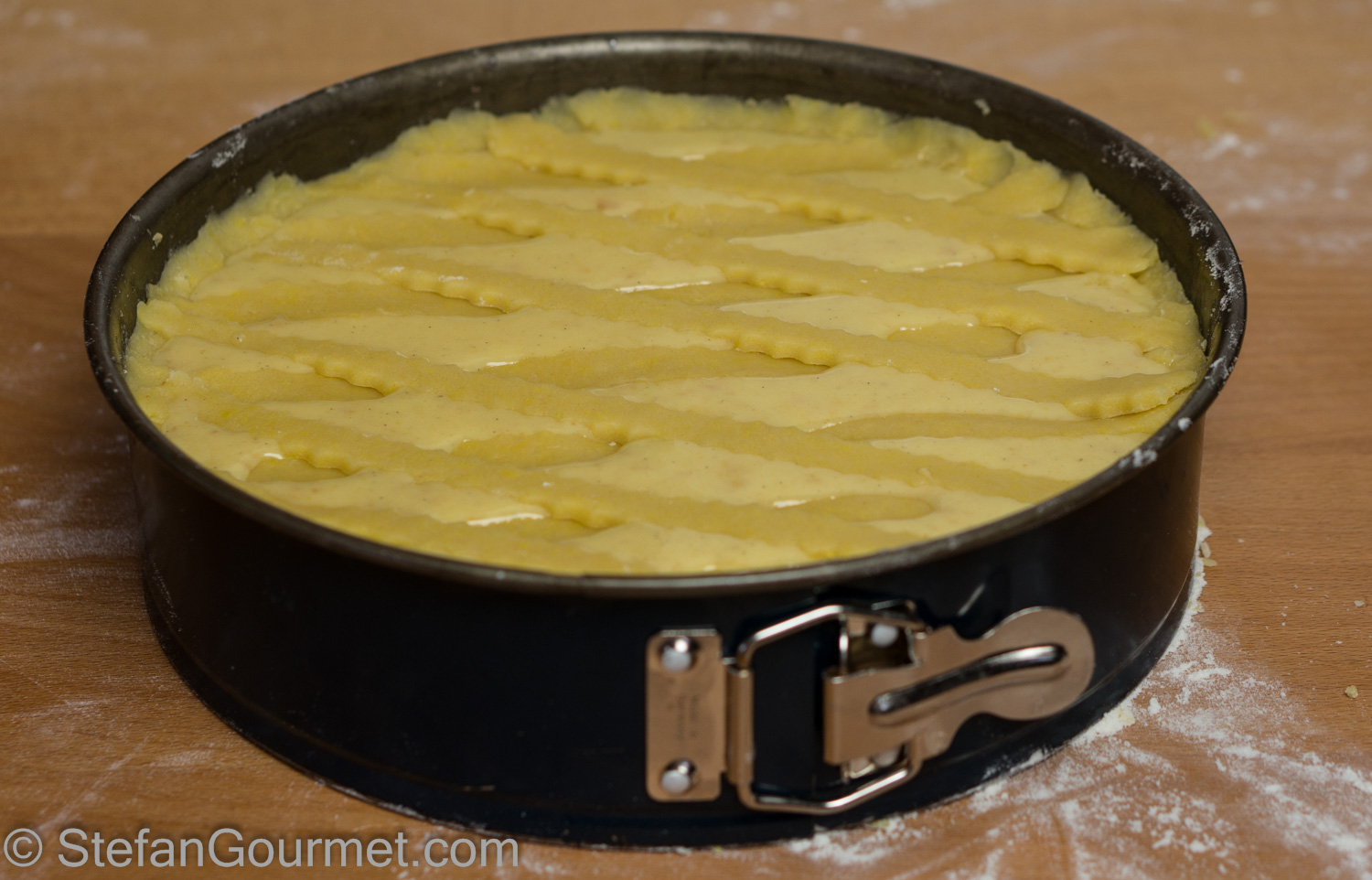 Line the pan with the pastry, reserving the pastry that sticks out to make the lattice.