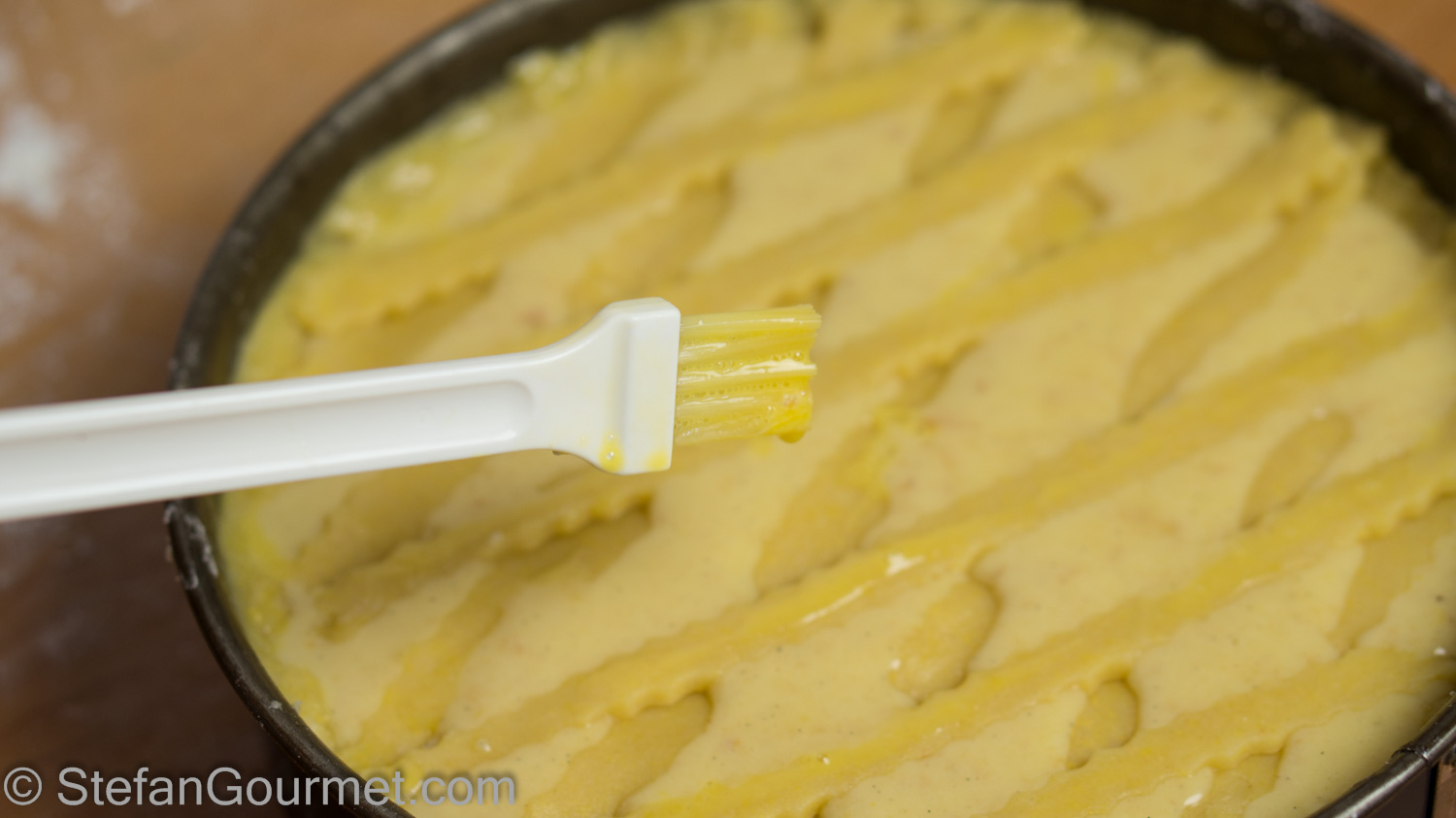 Very carefully arrange the strips of pastry on top.