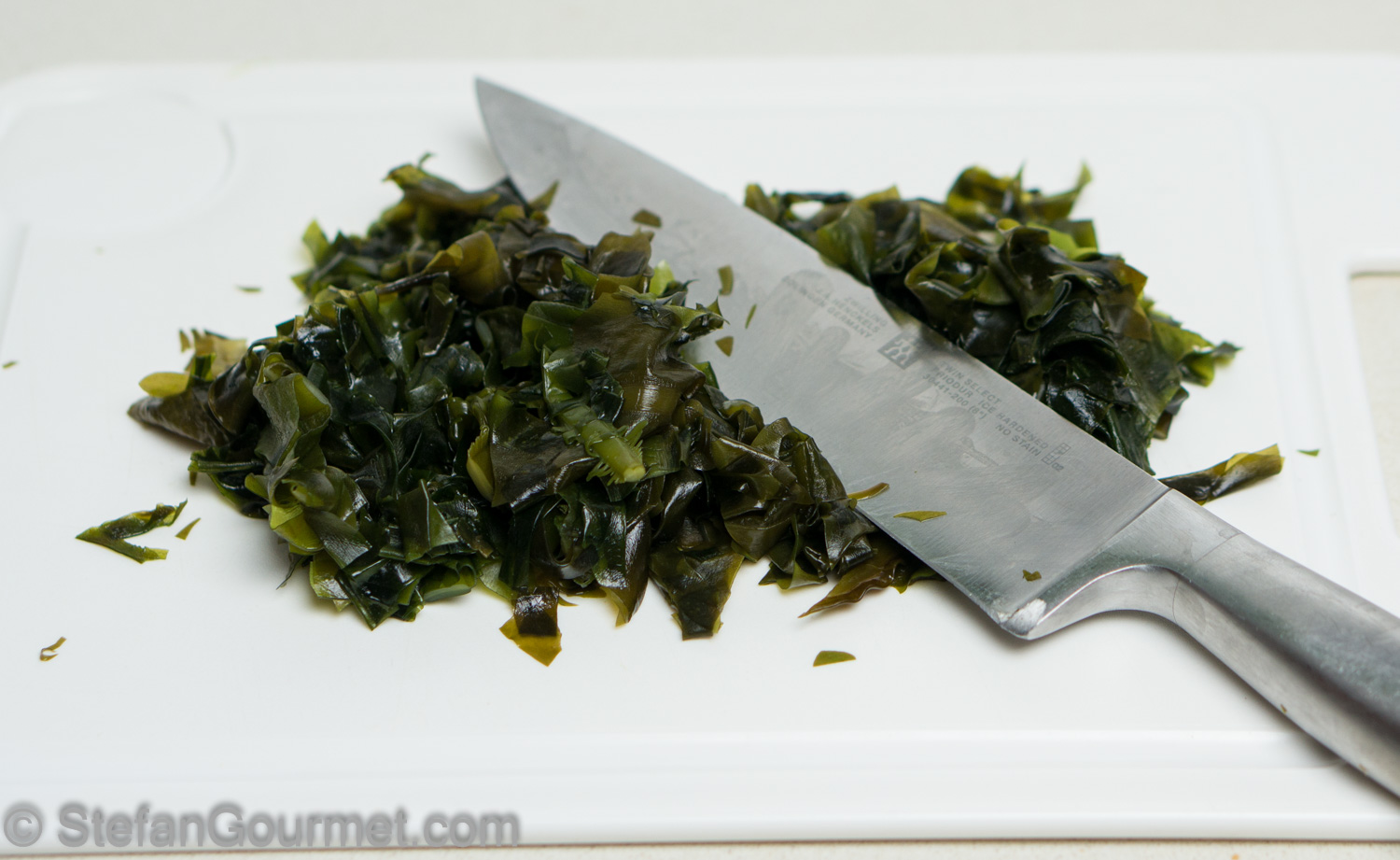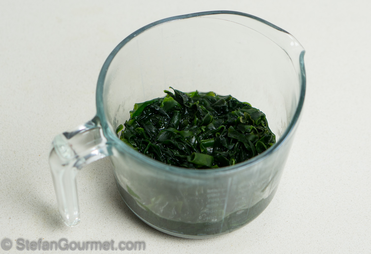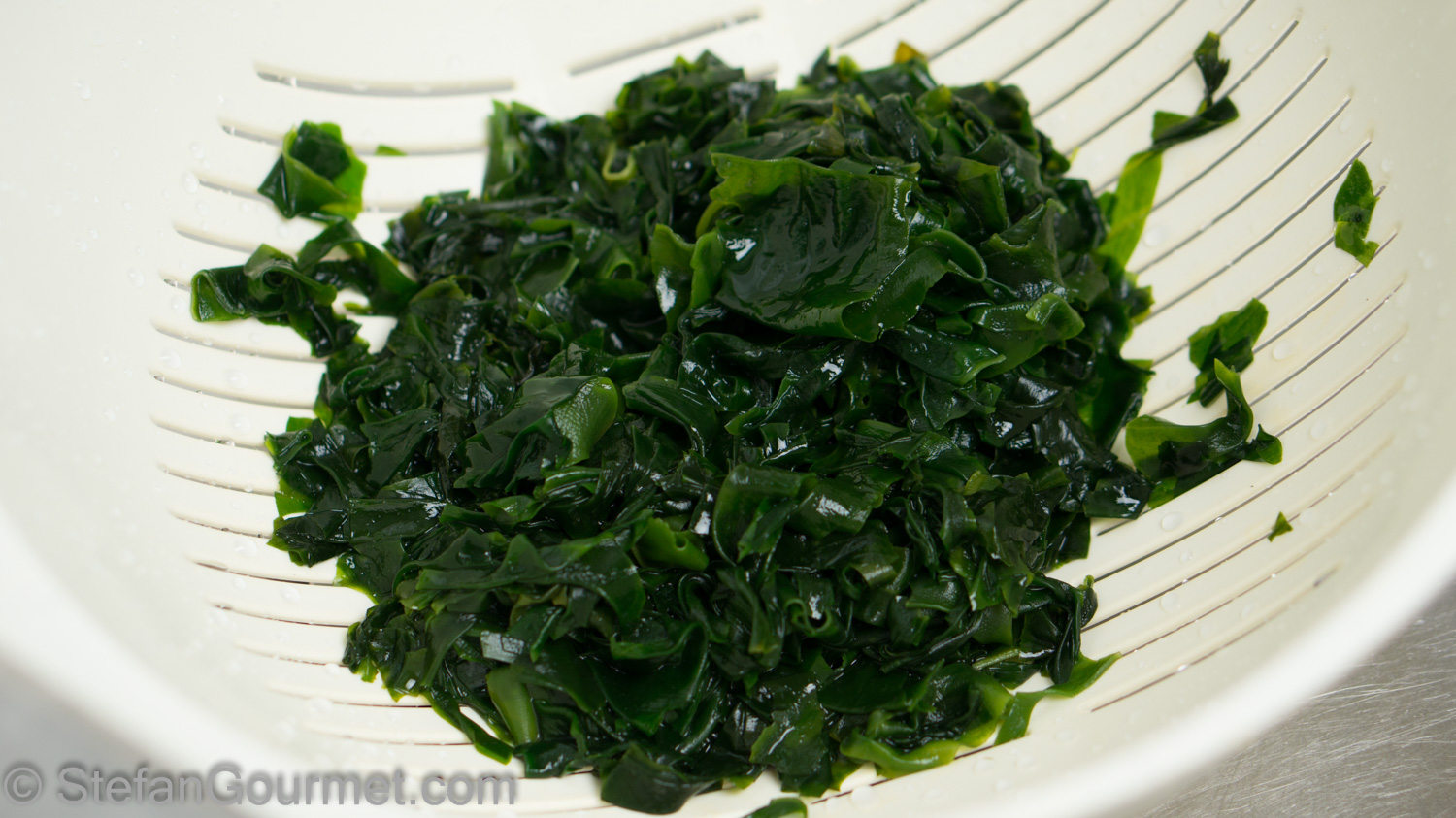 The salted seaweed should be soaked for 2 minutes in cold water to remove the excess salt. The soaking time of the salted wakame seems to be quite critical. When soaked too short, it is still too salty. When soaked for too long, the flavor weakens.