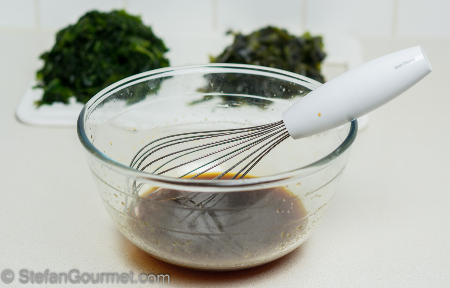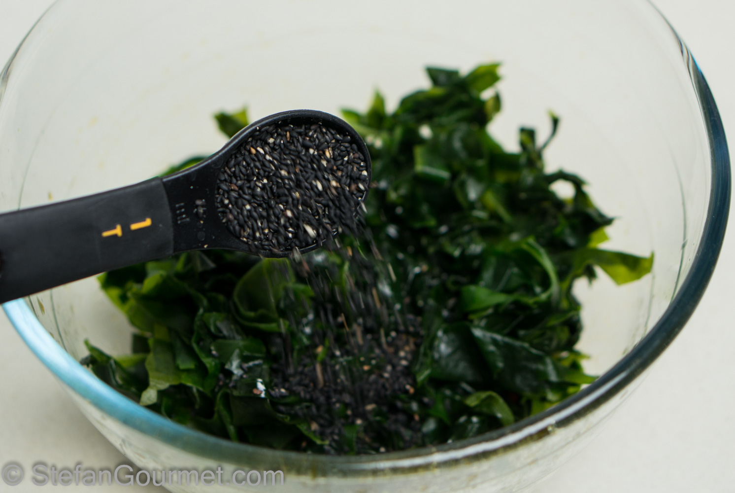 Add the dressing to the wakame. Add the sesame seeds as well.
