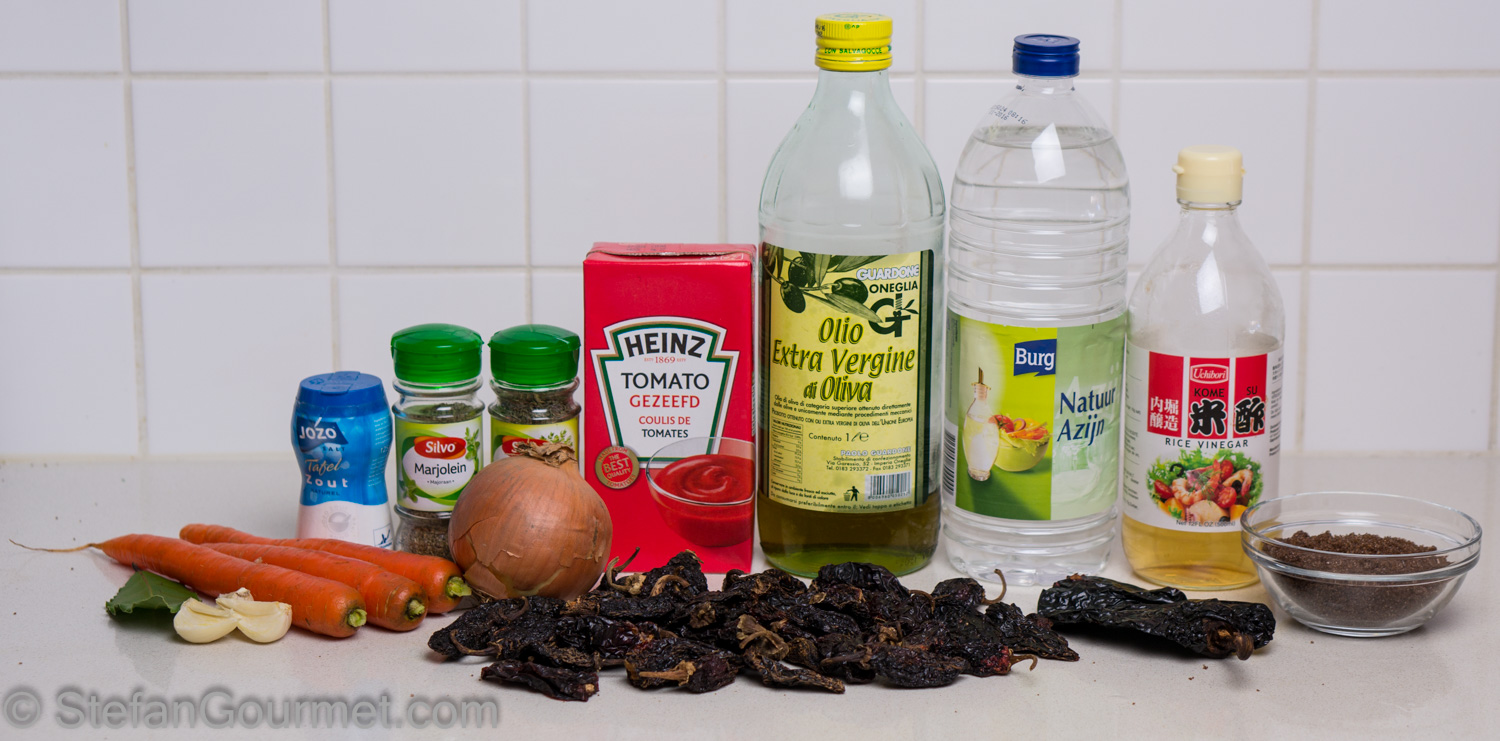 My favorite kind of chiles are chipotles because of their smokiness. Chipotles in adobo sauce, a sauce made from tomatoes and ancho chiles, are a great condiment. I love them for instance with chicken, mushrooms and cream. Chipotles in adobo sauce are available in cans, but since I like to make everything from scratch, I wanted to try making my own chipotles in adobo. I used a recipe by Pati’s Mexican table. It wasn’t hard at all, and the result was amazing. Chipotles in adobo from a can are great, but these homemade chipotles in adobo sauce have a more complex and well-rounded flavor. I will definitely make them again. I made a few adjustments, most importantly not using fresh tomatoes because they are out of season (and even if they were in season, tomatoes here are not that great). Here’s my version.