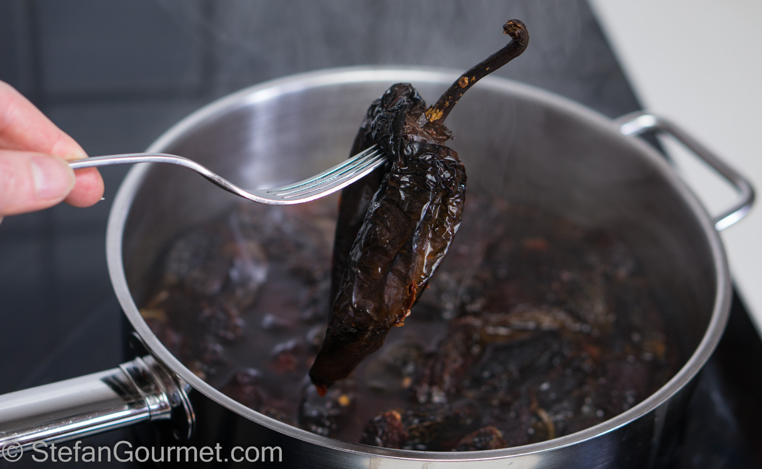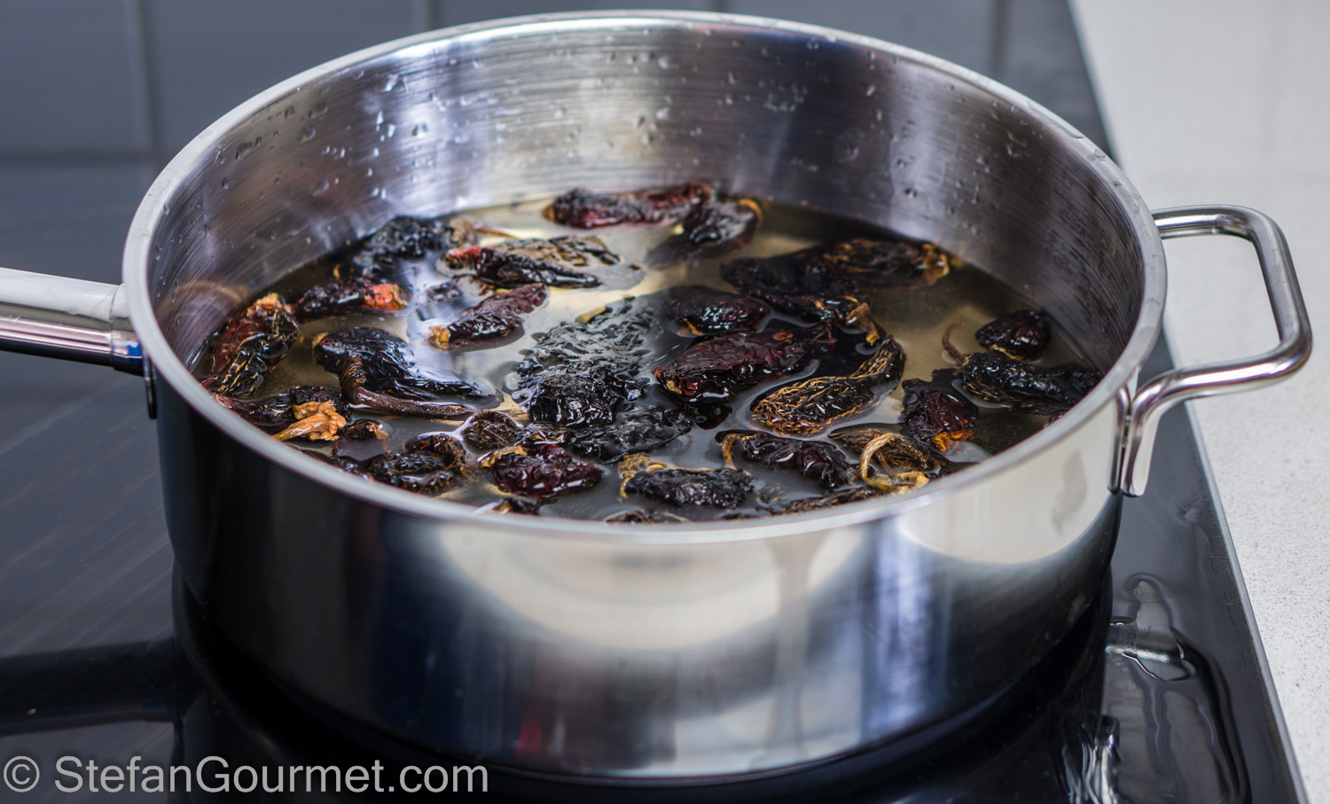 Turn off the heat and remove the ancho chile. Allow the chipotle chiles to steep in the hot water.