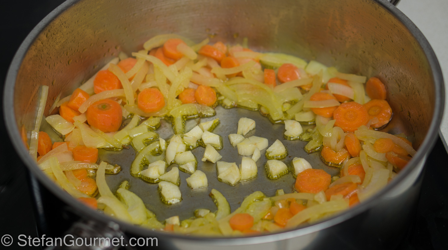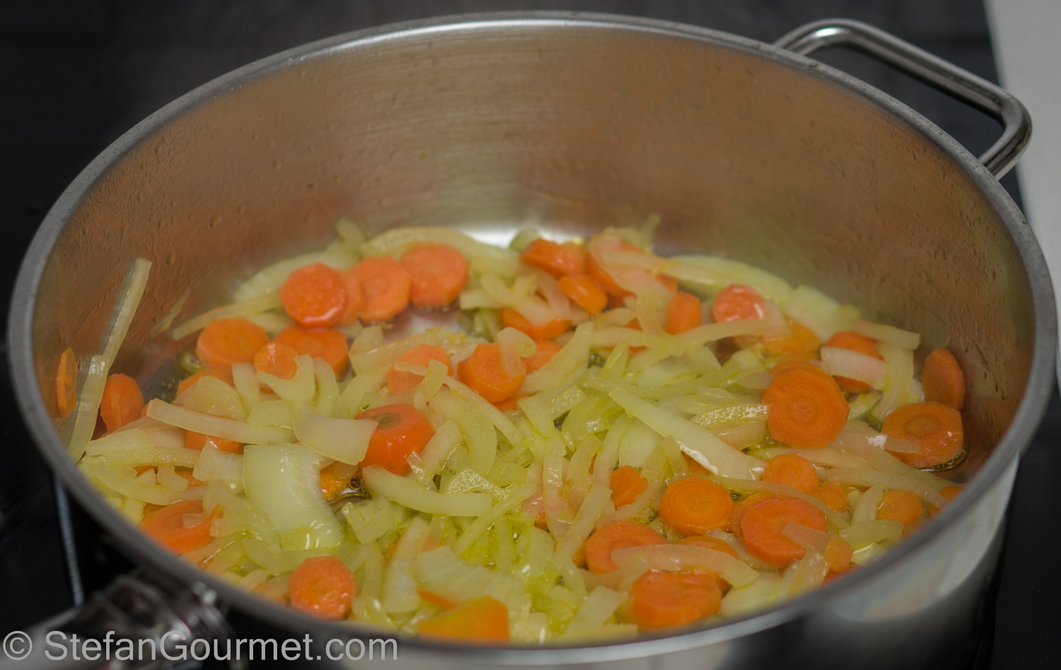 Heat the oil in a frying pan. Add the onions and carrots and cook over medium heat until the onions are translucent.