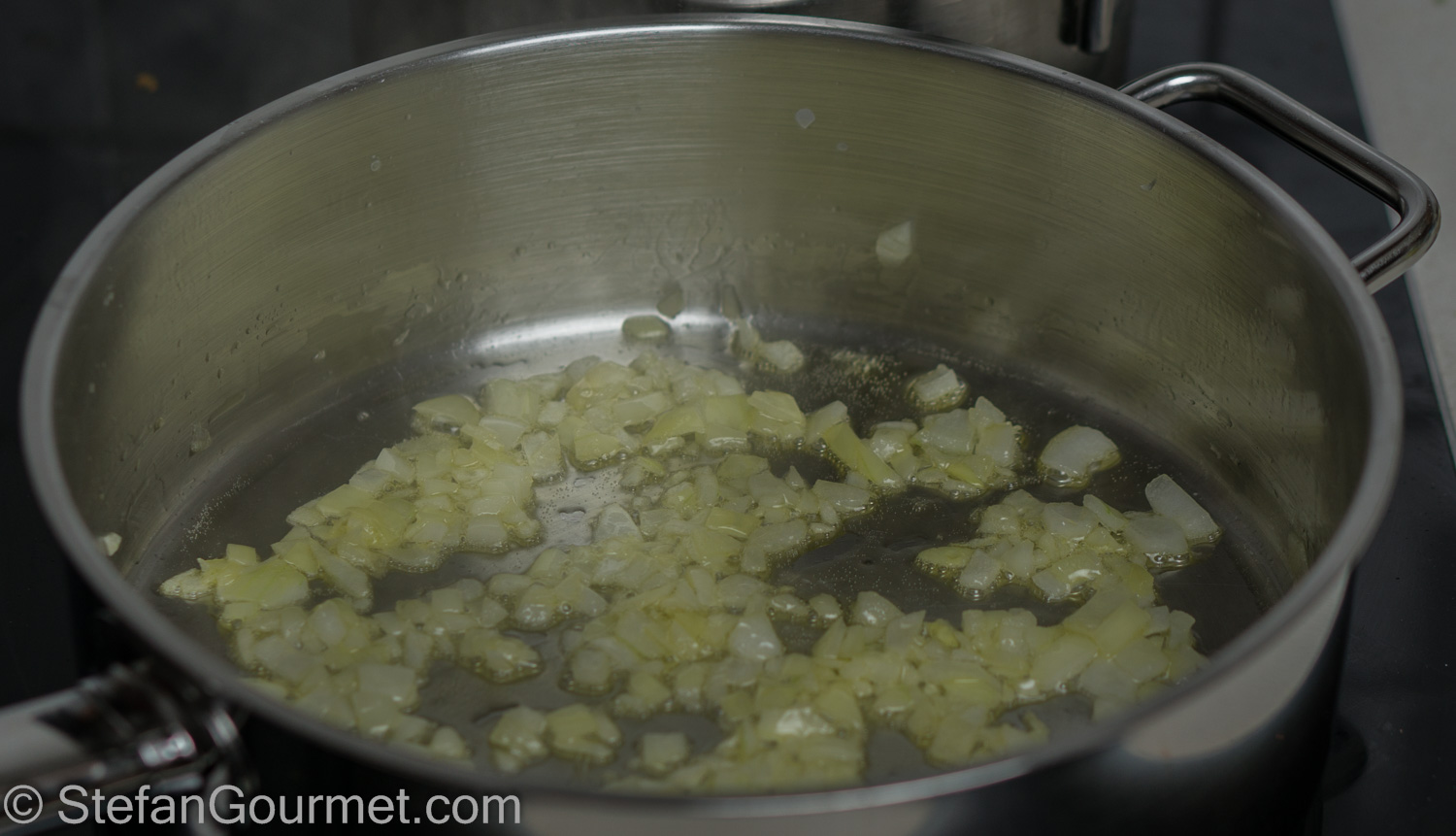 Melt 2 Tbsp of the butter in a wide thick-bottomed pan. Add the onion and sauté over medium heat until it becomes translucent.