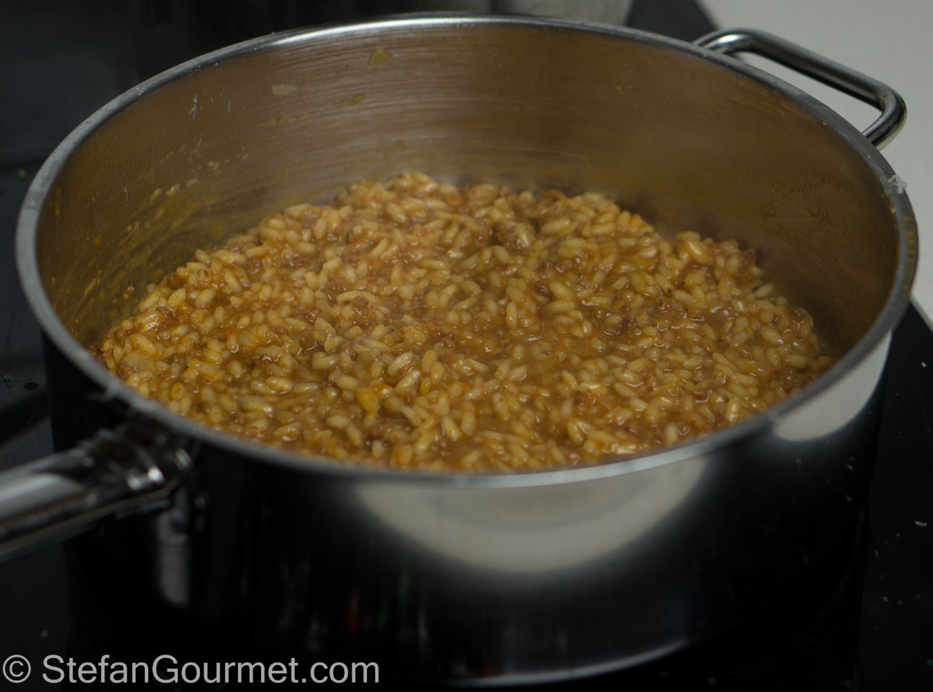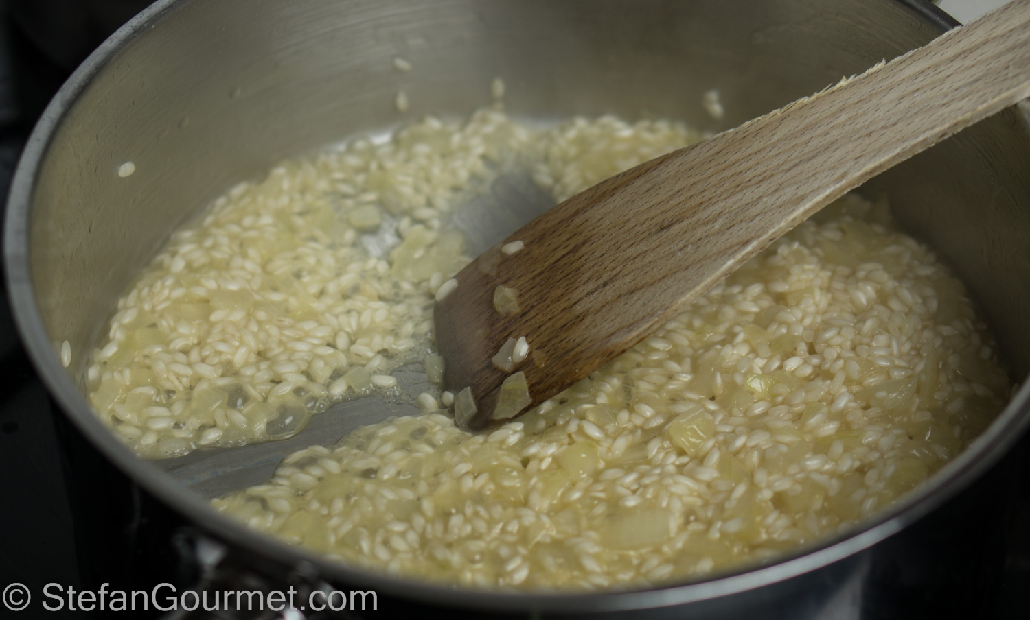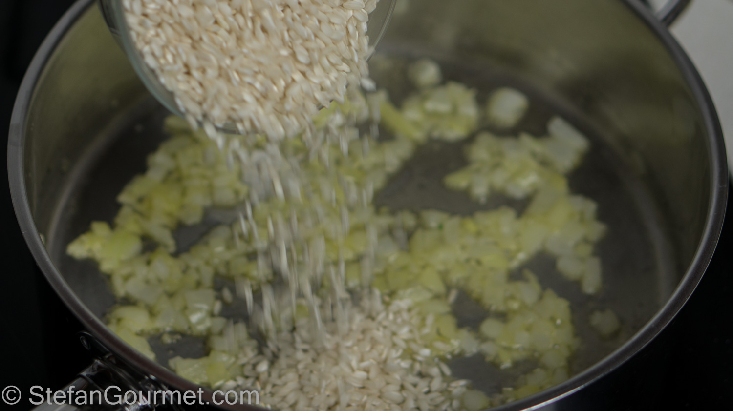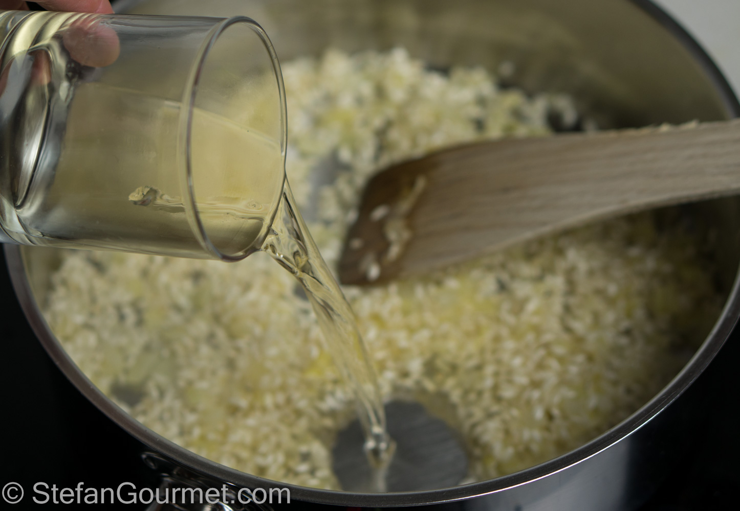 Increase the heat to medium high and deglaze with the white wine. Stir until the wine has been absorbed by the rice.