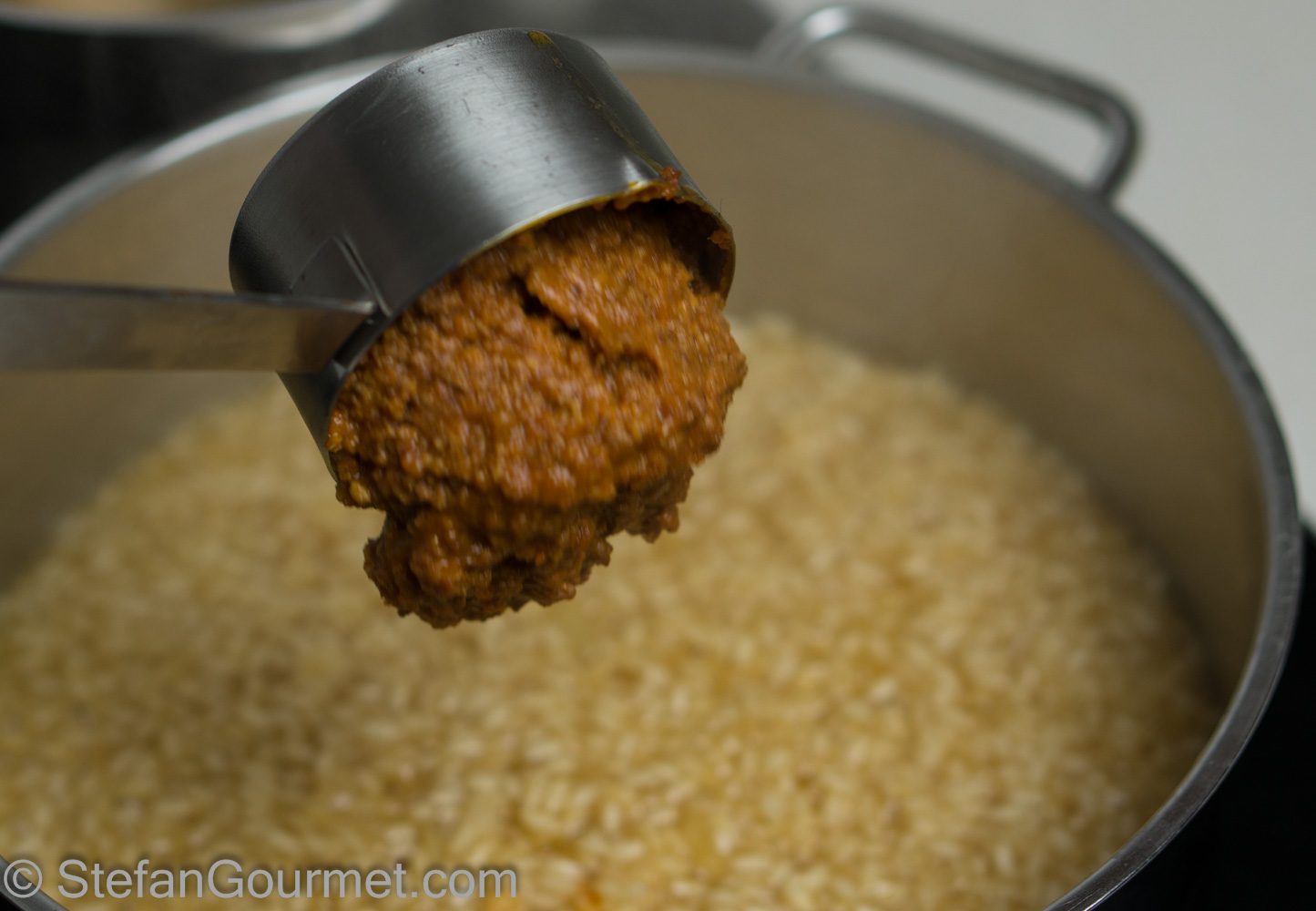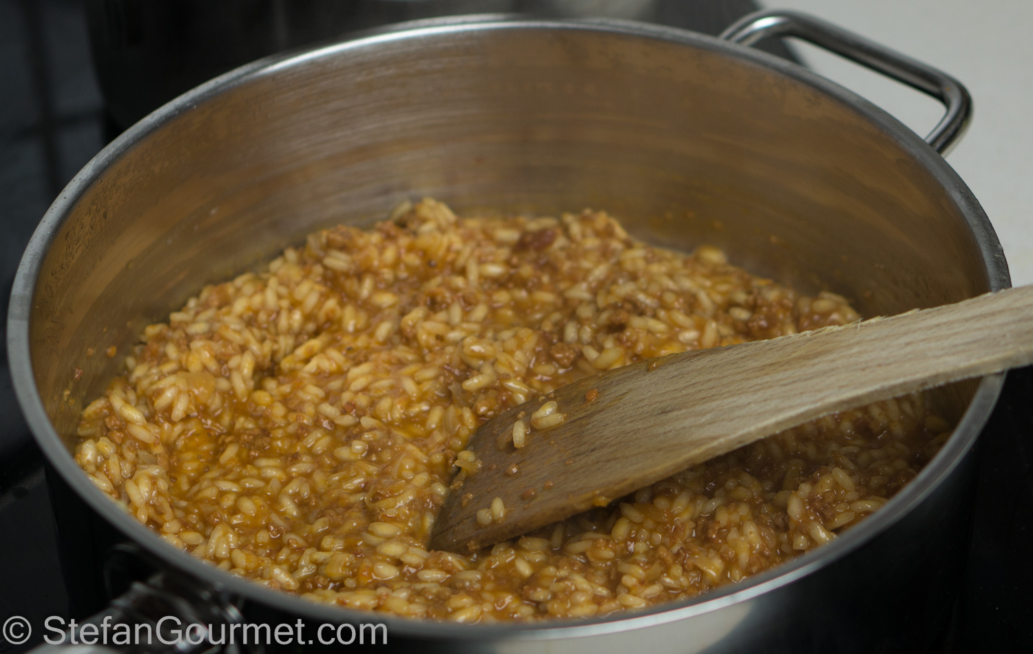 Stir to incorporate the ragù. Taste whether the rice is done. Continue to add more stock and stirring until the rice is al dente.