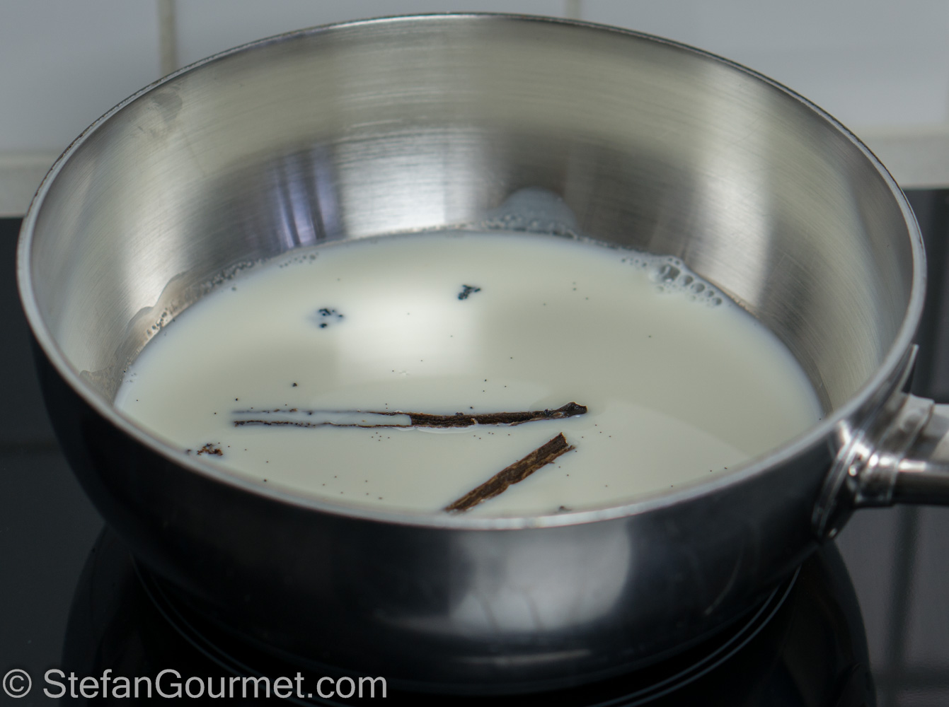 Put most of the milk in a saucepan, reserving a couple of tablespoons. Add the vanilla bean, cut in half lengthwise, and bring to a boil.