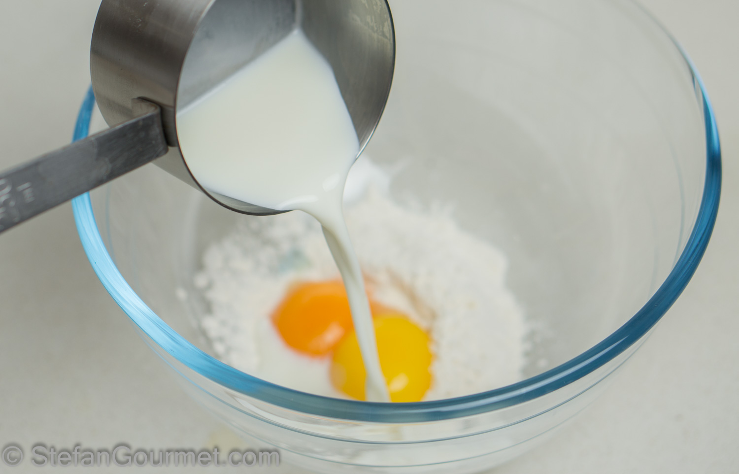 Put the flour with the egg yolks in a bowl. Add the reserved cold milk.