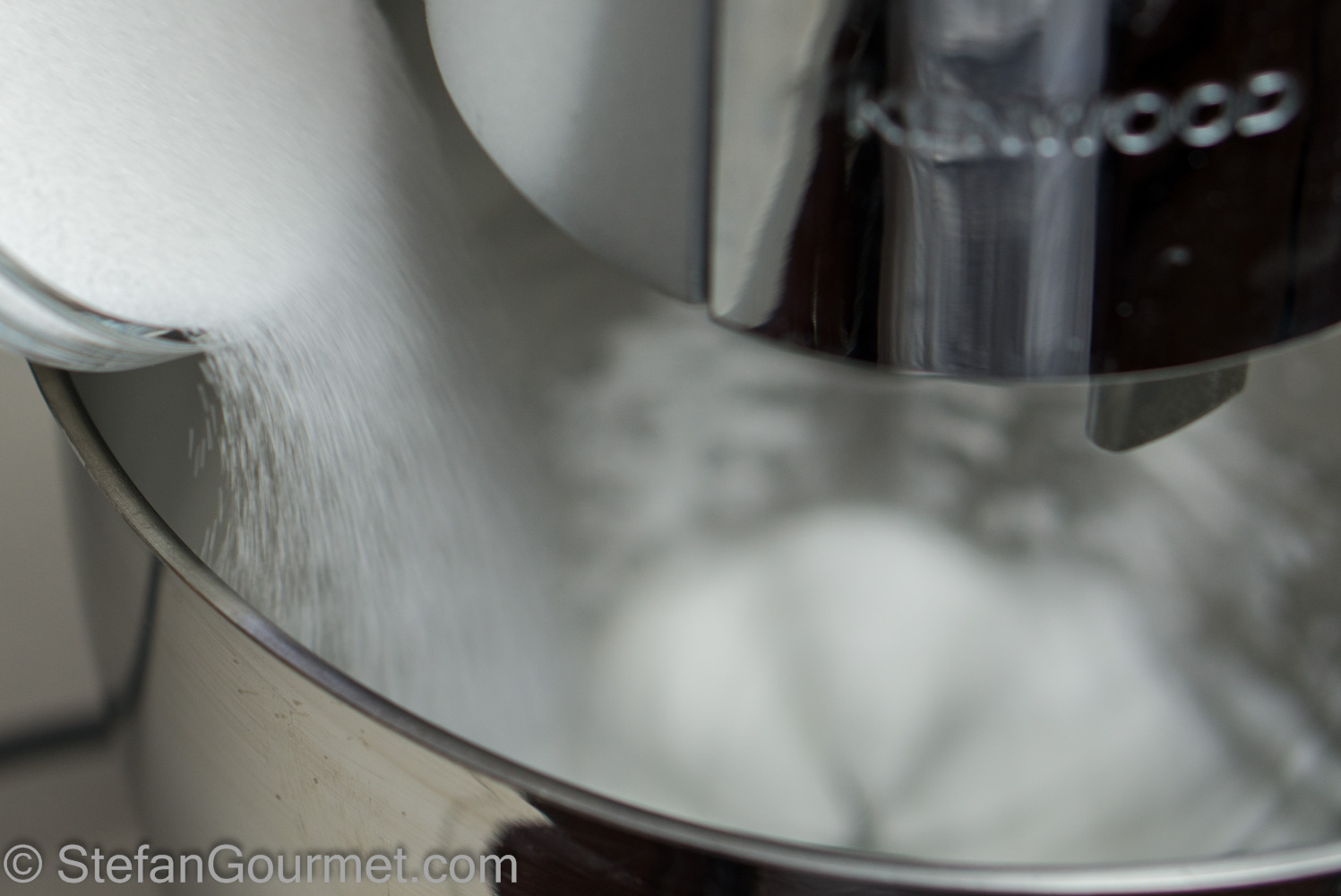 Add 110 grams of sugar while the motor runs.