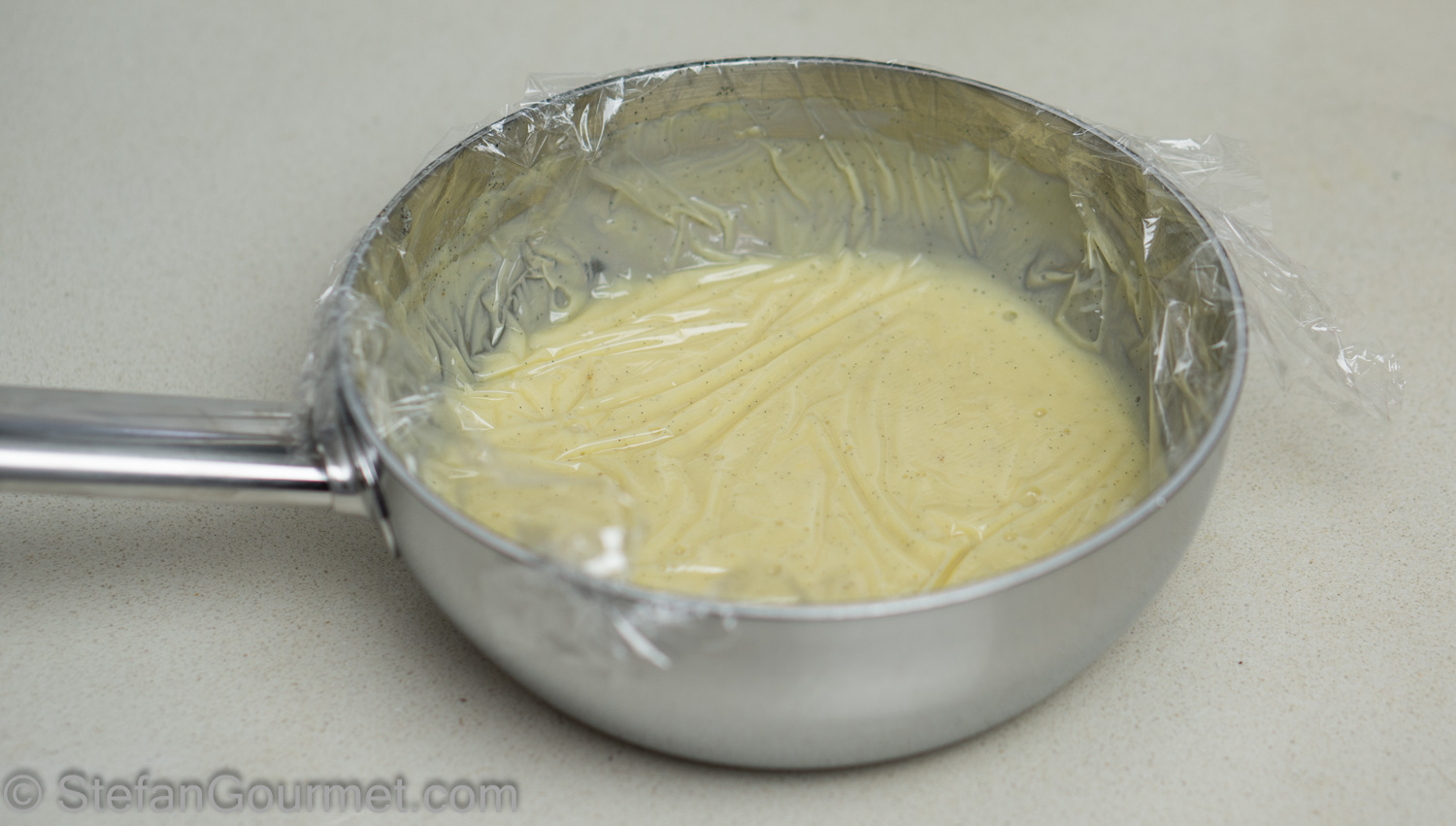 Cover with plastic wrap such that the foil touches the surface of the pastry cream. This will prevent the formation of a skin.
