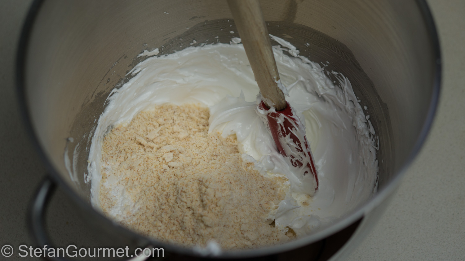 Gently fold the hazelnut powder into the meringue, working from the bottom.