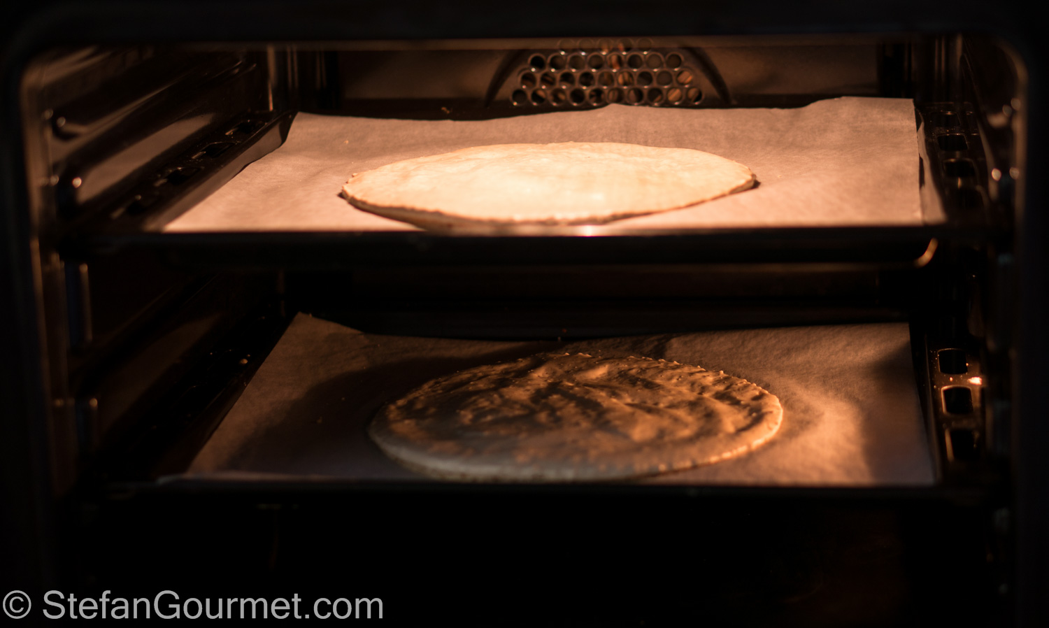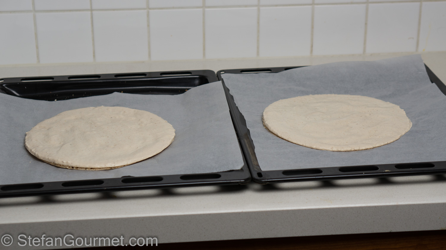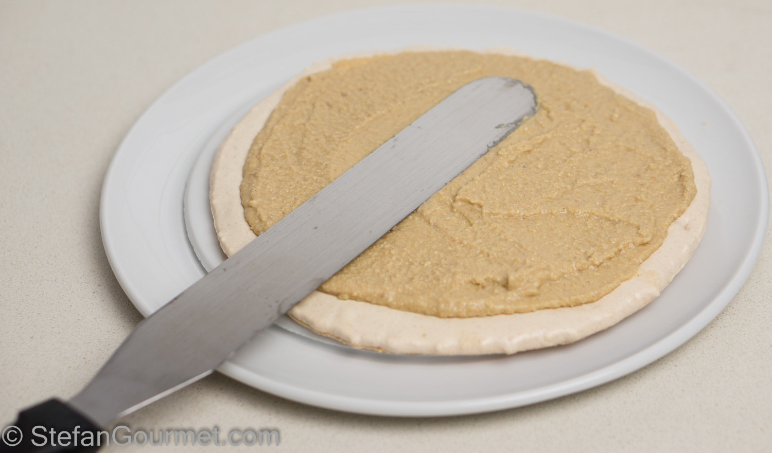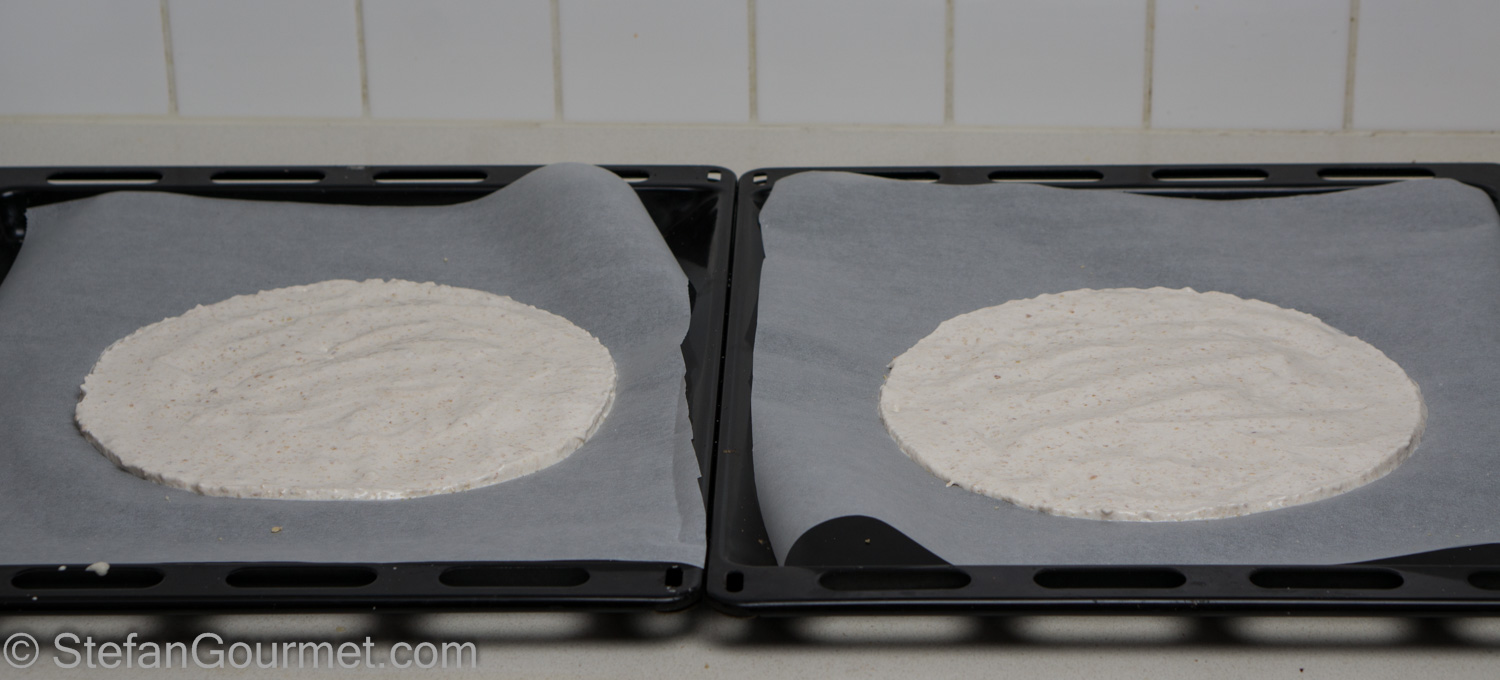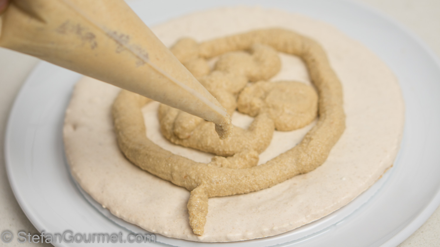 Line two baking sheets with parchment paper. On each baking sheet, create a 24 cm (9″) circle of the hazelnut meringue.