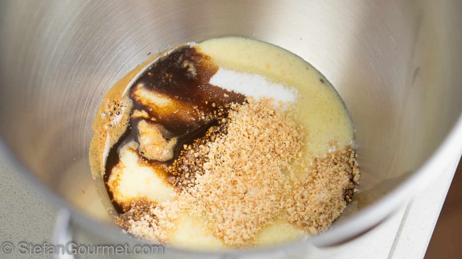 Combine the pastry cream, the remaining 50 grams sugar, the reserved 2 tablespoons of the ground hazelnut mixture, and the coffee mixture in the bowl of the stand mixer.