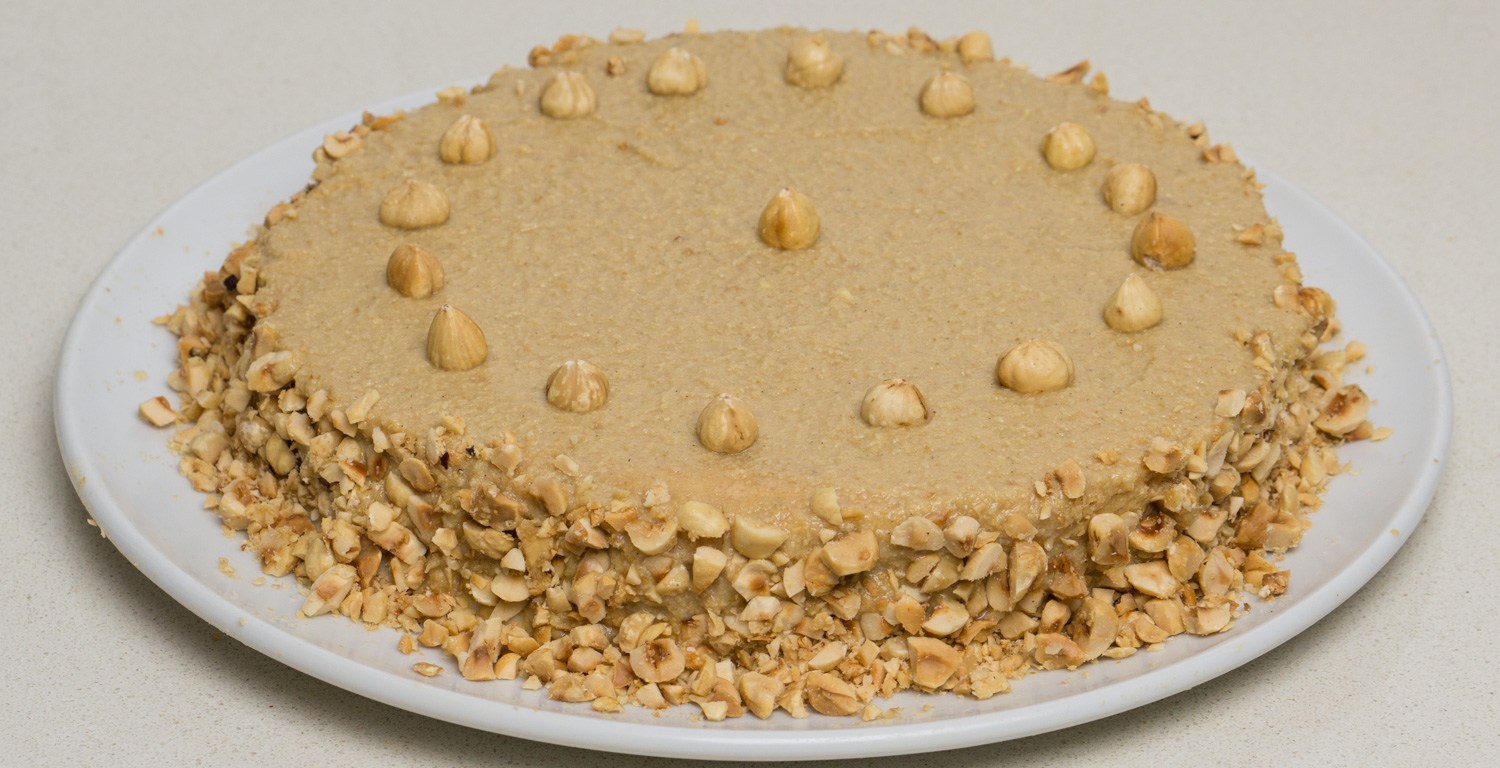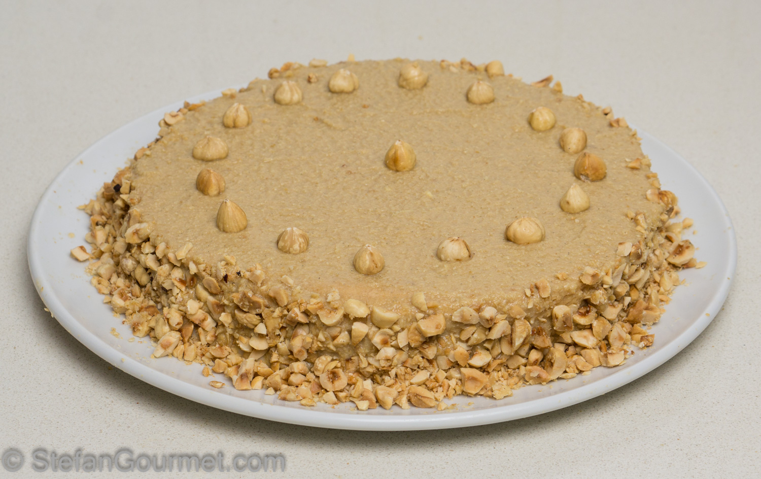 Decorate the top with hazelnuts and the sides with the chopped hazelnuts.