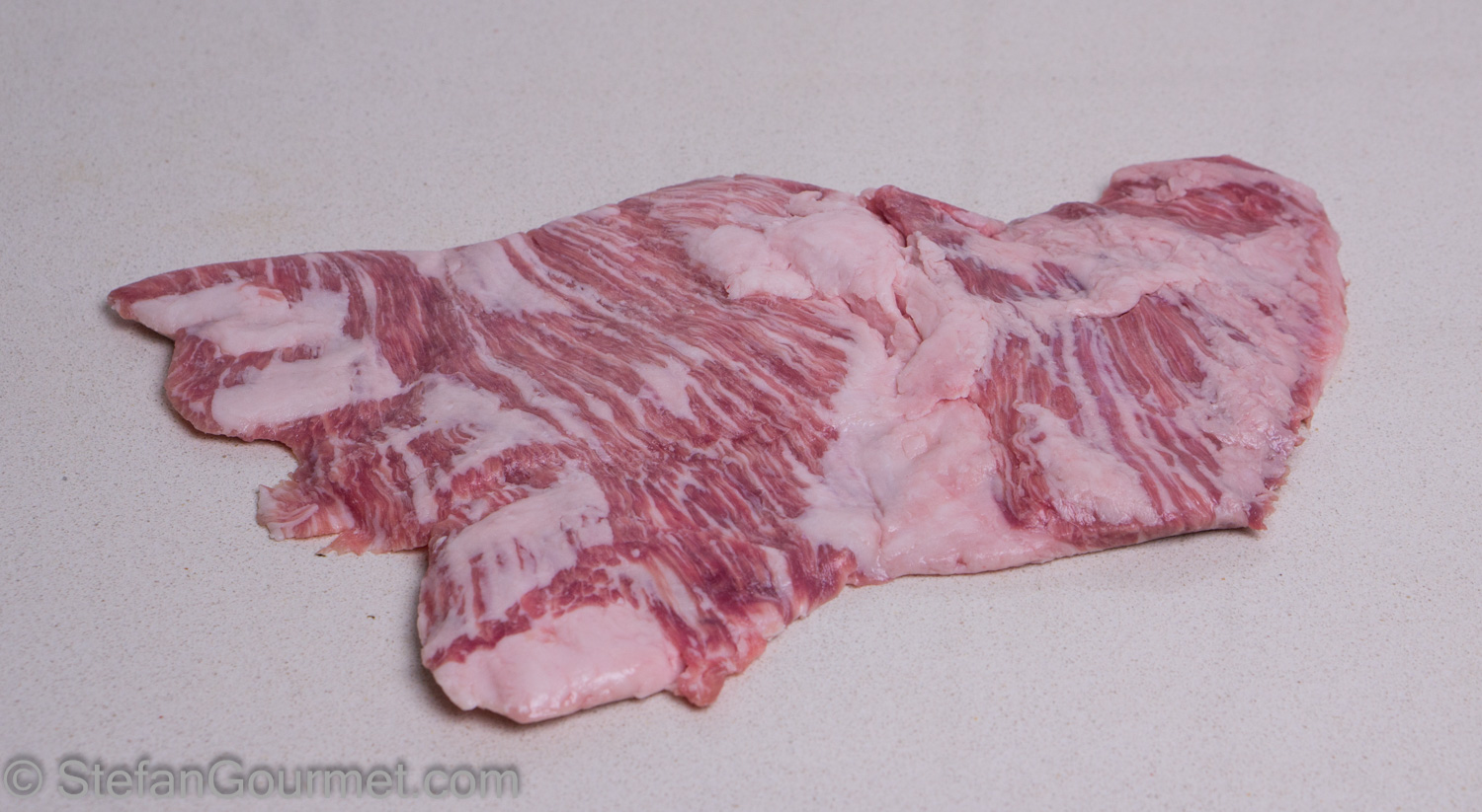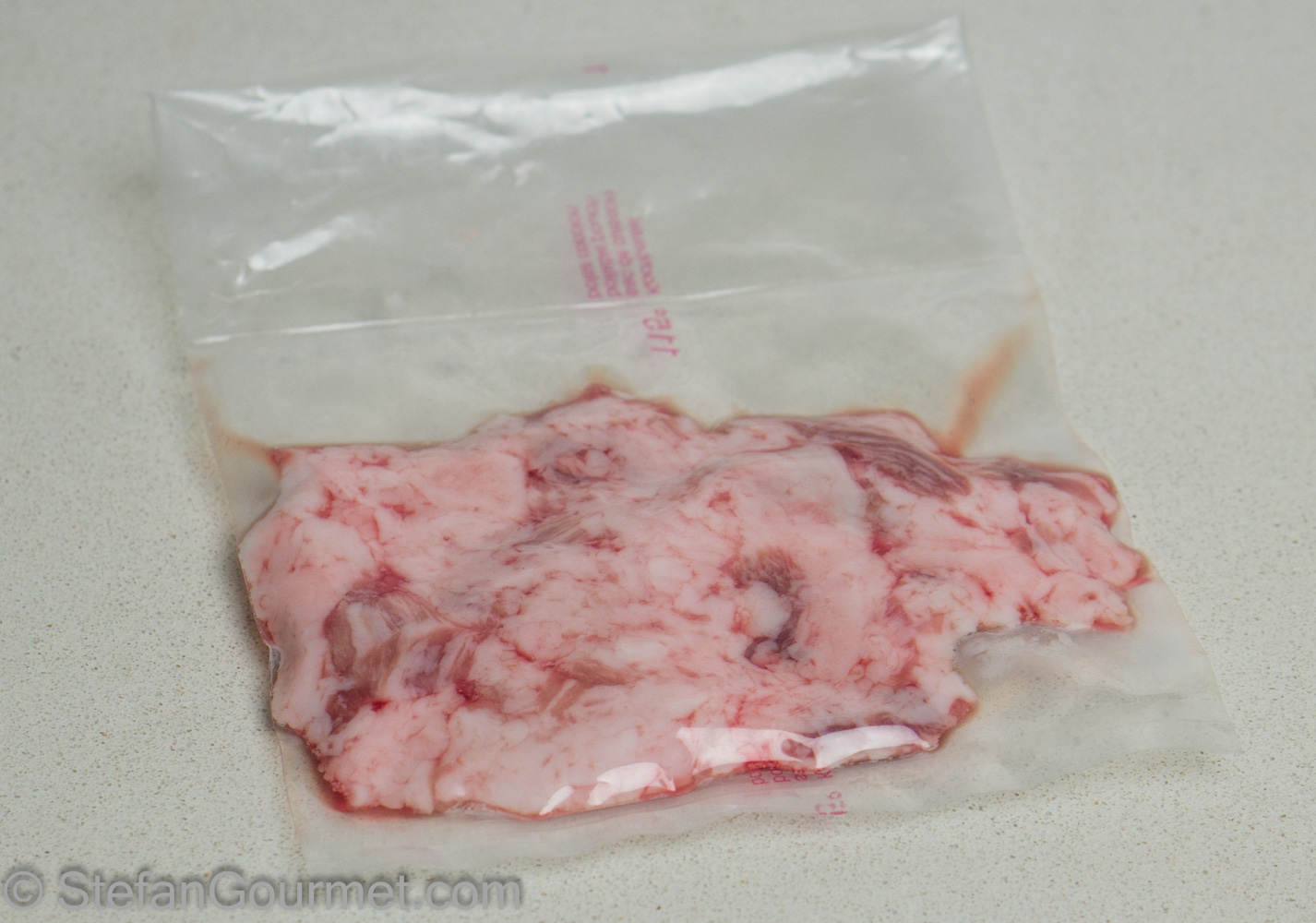 “Secreto” is a cut of iberico pork that is called the “butcher’s secret”. It is very flavorful and marbled, and fairly thin. So thin in fact, that it made me think of veal scaloppine. One of my favorite preparations of veal scaloppine is with prosciutto and sage, and is called saltimbocca. And iberico pork is most famous for its jamón, Spanish prosciutto. So I thought, why not try to make secreto iberico saltimbocca? (Perhaps it would be appropriate to translate saltimbocca into Spanish, i.e. saltenboca.) The only problem is that veal scaloppine are cut from a very tender part of veal, and cook in minutes. Secreto would be a bit tough if cooked the same way. And so I decided to cook the secreto sous-vide first, which I have done successfully before for 24 hours at 57ºC/135ºF.