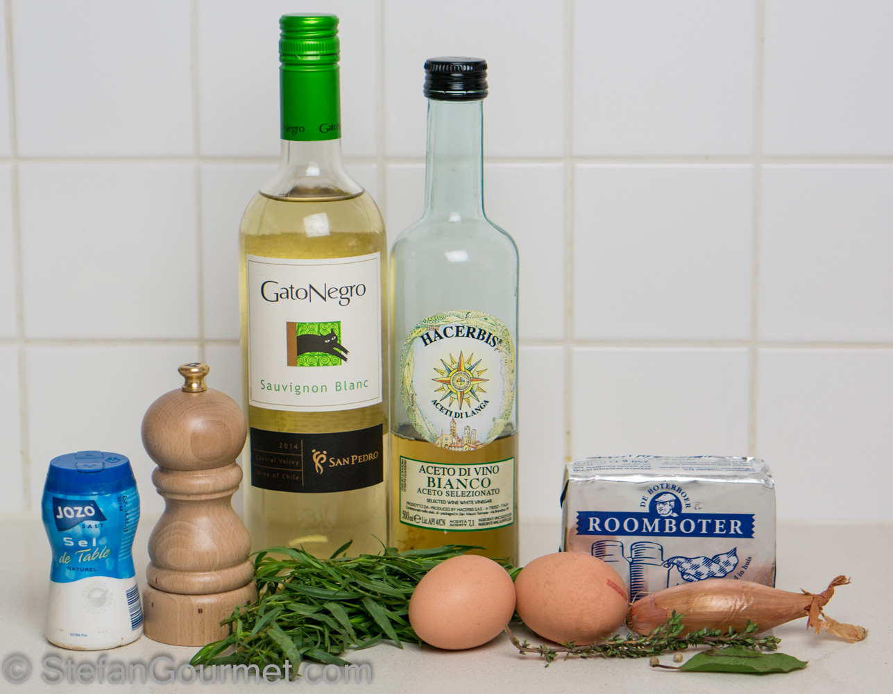 Put the white wine, the white wine vinegar, the reserved tarragon stems, the shallot, the bay leaf, the thyme, and the crushed peppercorns in a saucepan. Bring to a boil, then reduce the heat to a simmer.