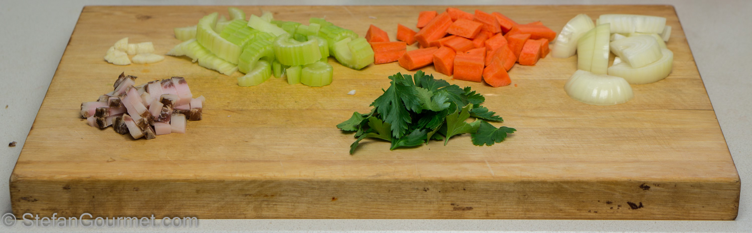 Mince the guanciale, garlic, celery, carrot, parsley, and onion. Or chop it roughly…