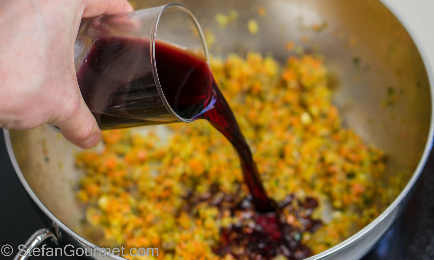 Then deglaze with the red wine and the beef stock.