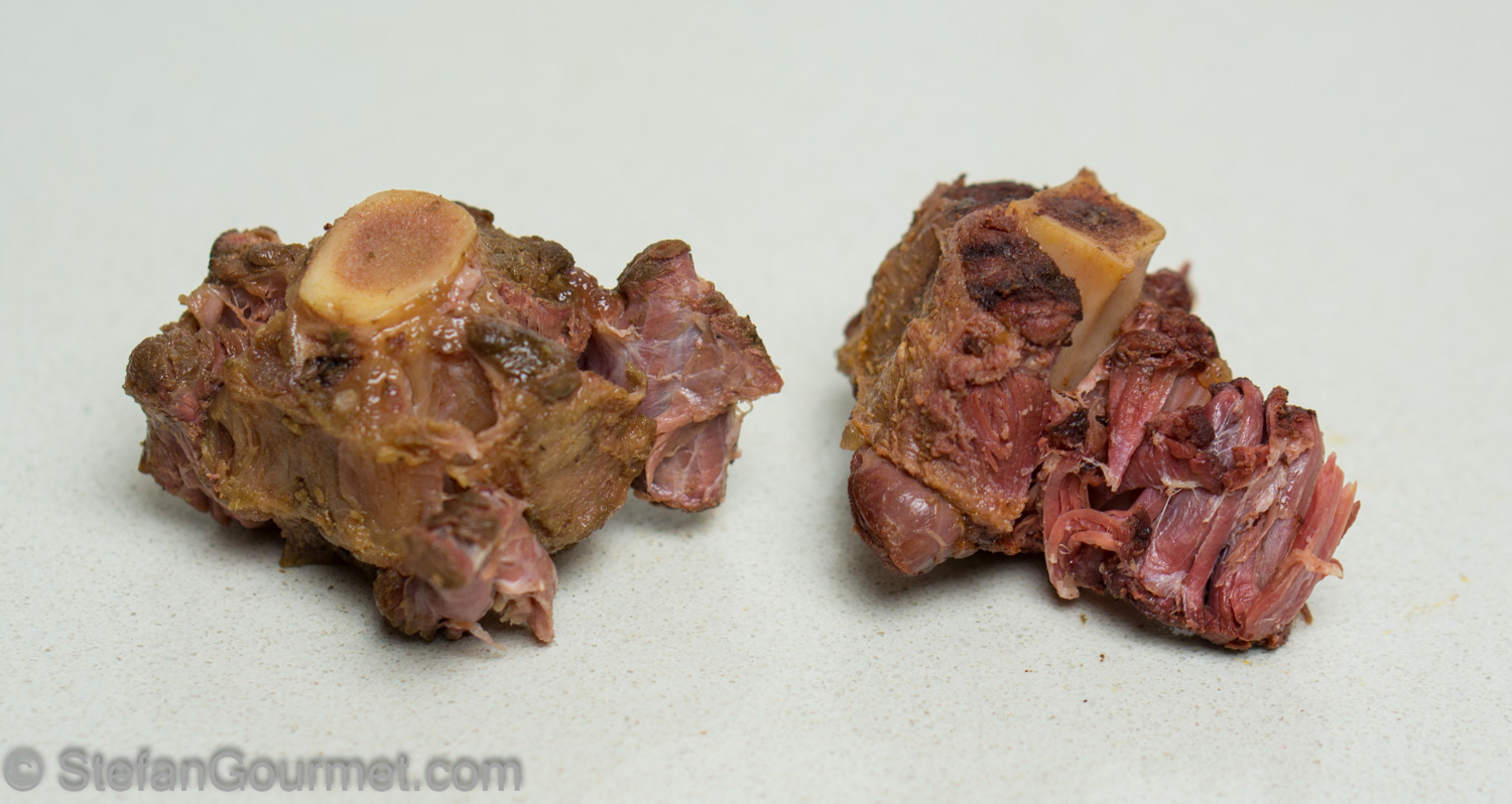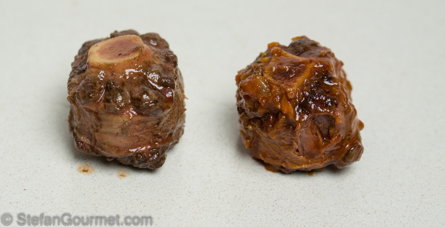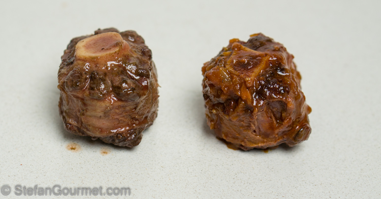 As I wanted to taste whether the sauce had penetrated into the meat while cooking sous-vide, I rinsed both pieces of oxtail in cold running water to remove any sauce on the outside.