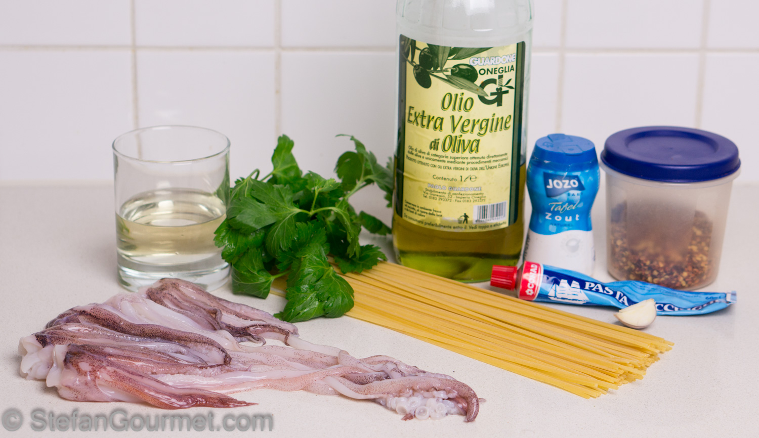 Calamari are mostly known as deep fried rings. They are especially delicious when you make them from fresh calamari. Calamari do not only consist of a body (that is cut into rings) but they also have tentacles. You could deep fry those as well, but you could also use them to make a great pasta dish. It takes about 20 minutes to turn leftover calamari tentacles into linguine ai tentacoli di calamari. It is quick, simple, and delicious. Just like Italian food is supposed to be. Here’s what I did…