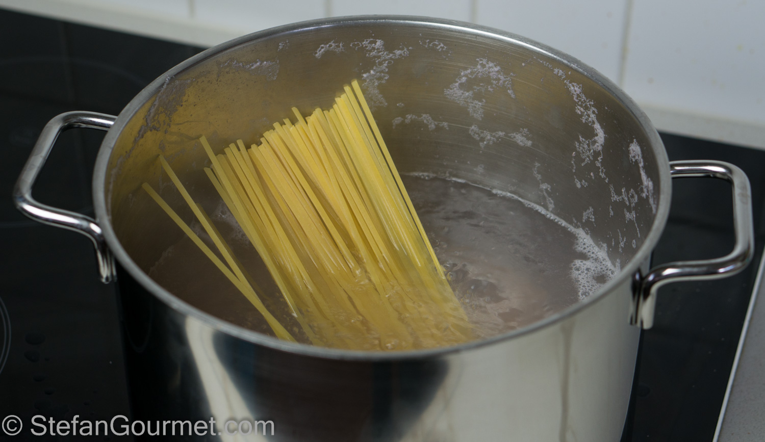 Now put the linguine in the boiling water and set the timer for the time indicated on the package for al dente.