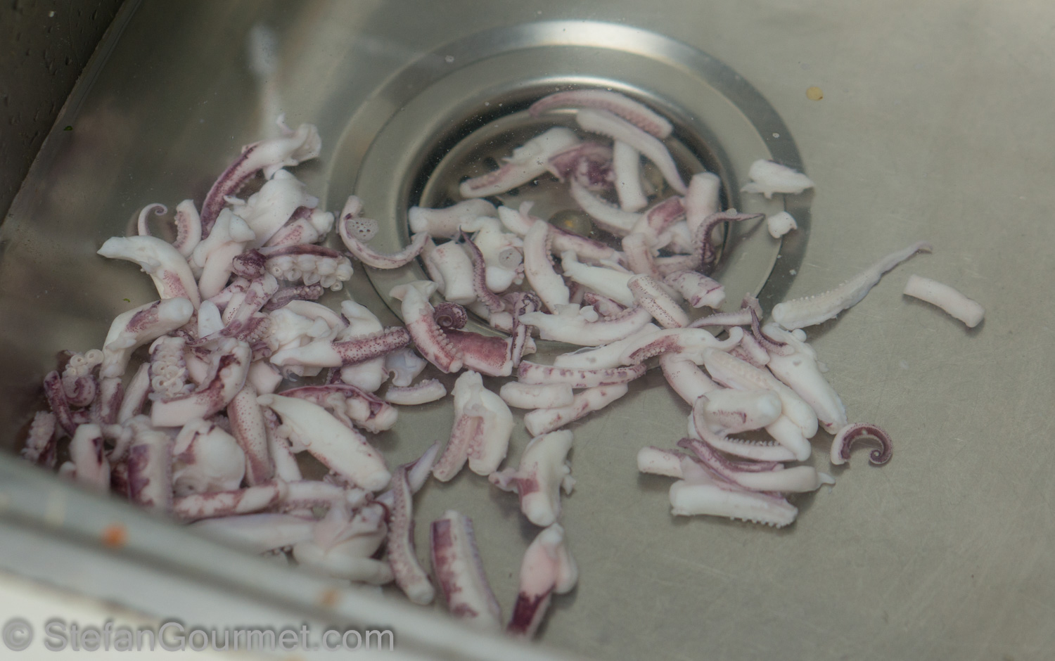 Bring a large pot of water to a boil. In the meantime, prepare the calamari tentacles. Each calamari has 8 tentacles. This is everything below the eye (the eye and everything above is discarded). Cut this into separate tentacles, and each tentacle into 3-5 cm (1-2 inch) pieces. Peel off the skin where you can.