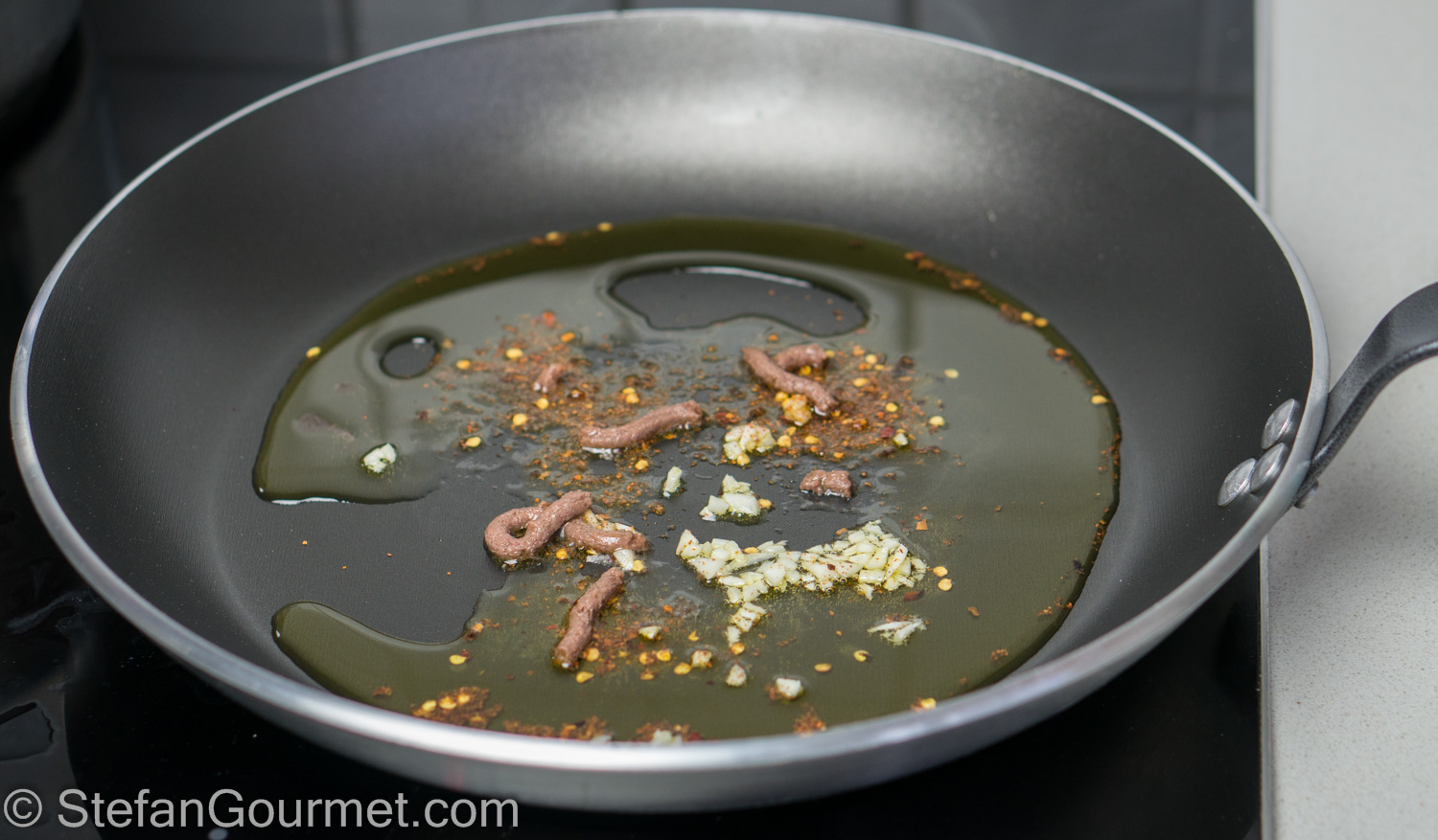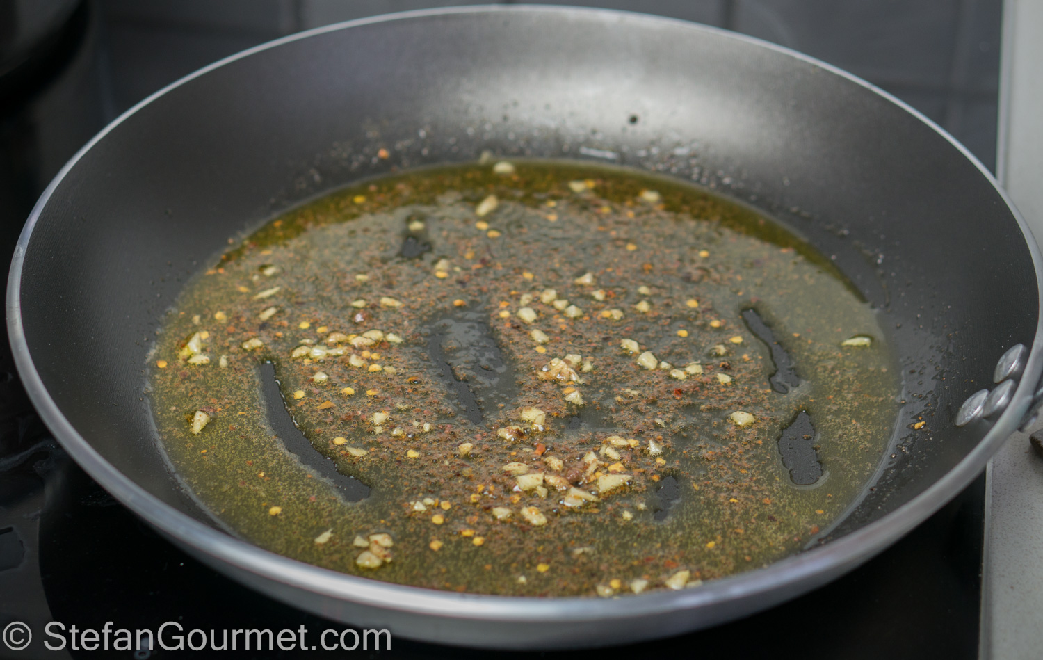 Meanwhile, heat the olive oil in a frying pan. Add the garlic, anchovies, and chilli flakes.