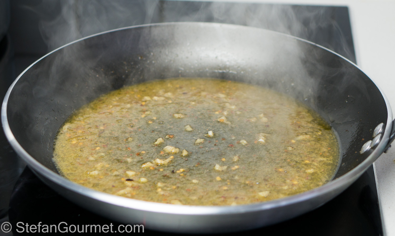 Add the white wine before the garlic starts to color.