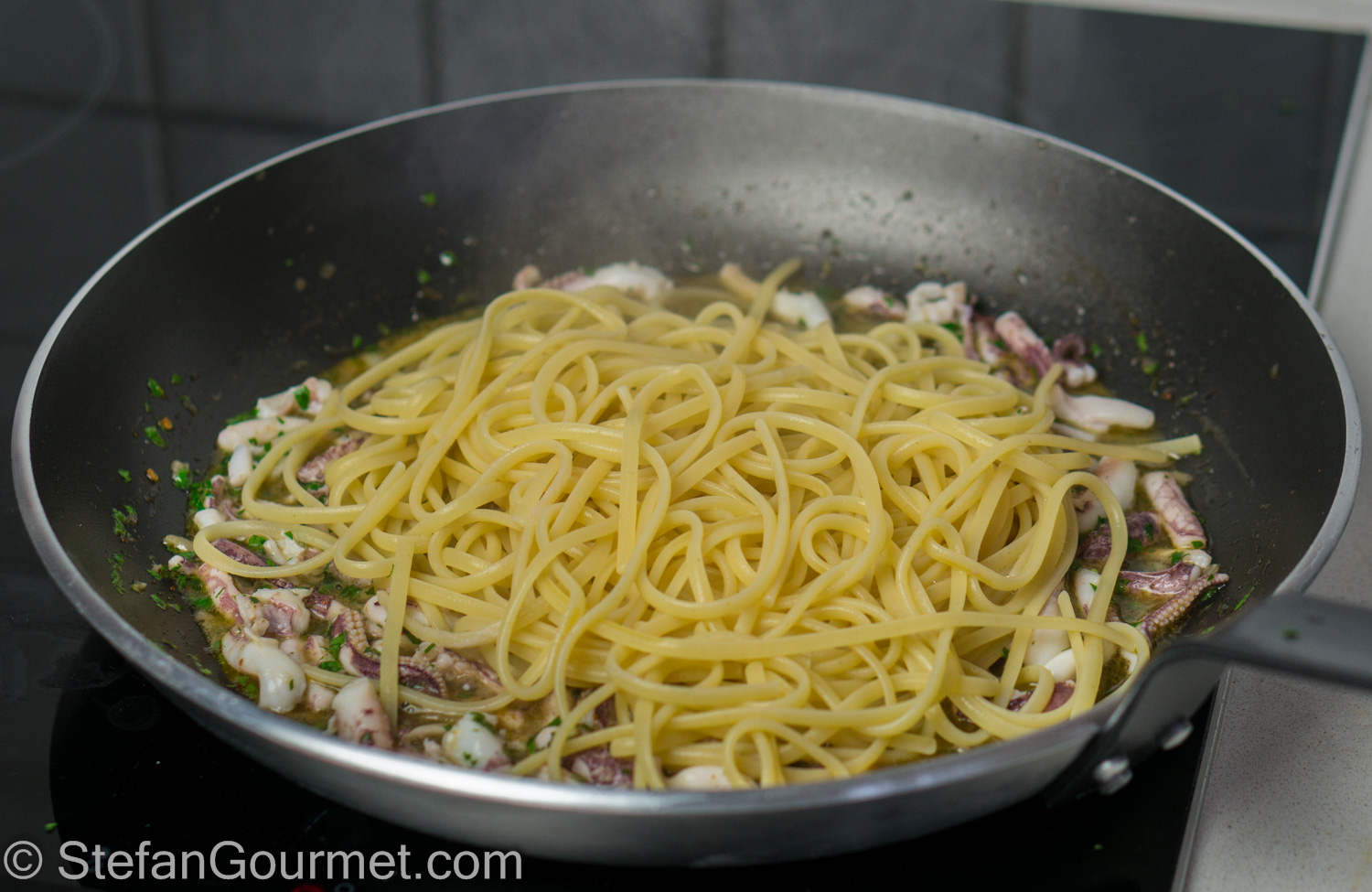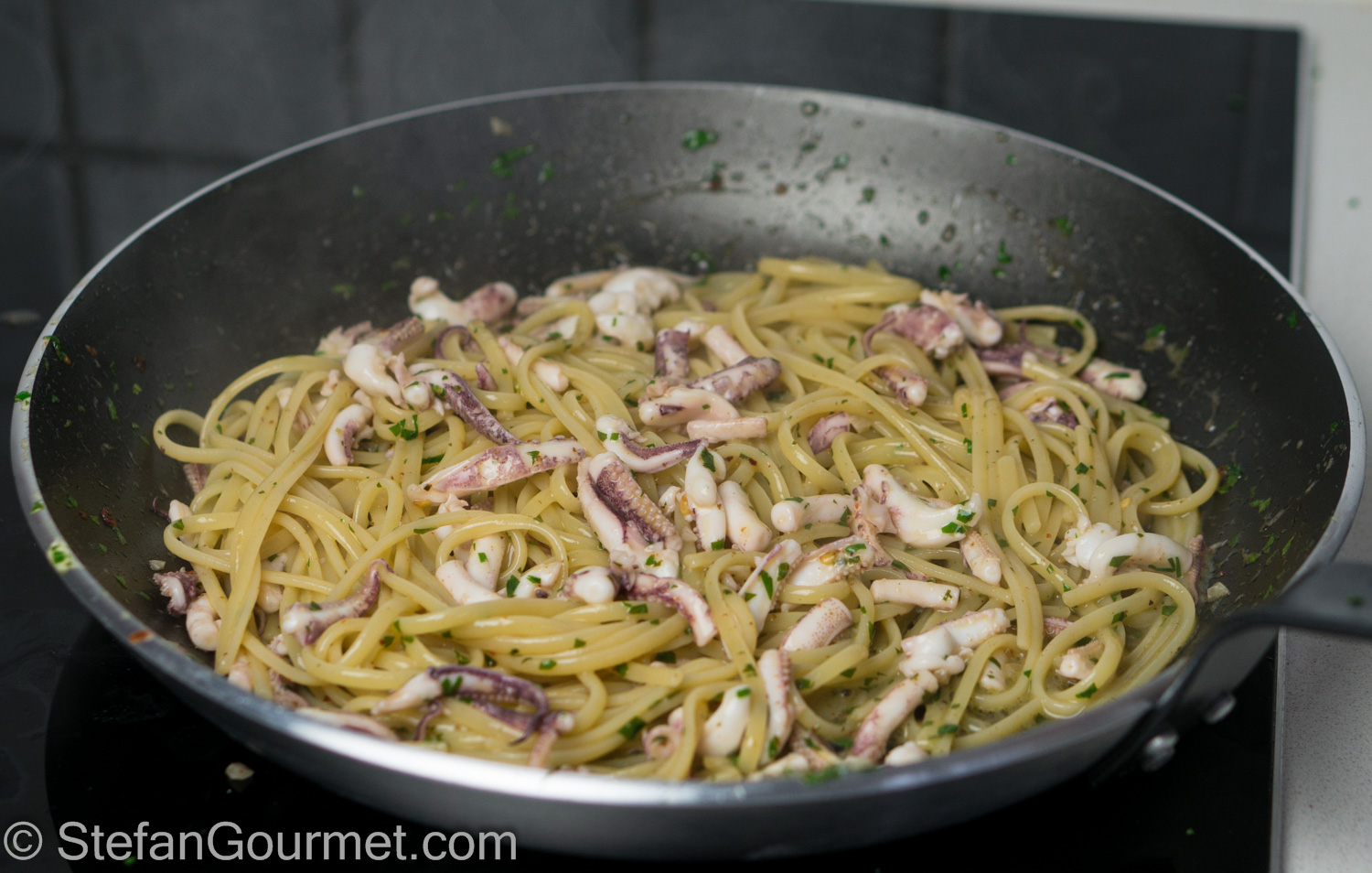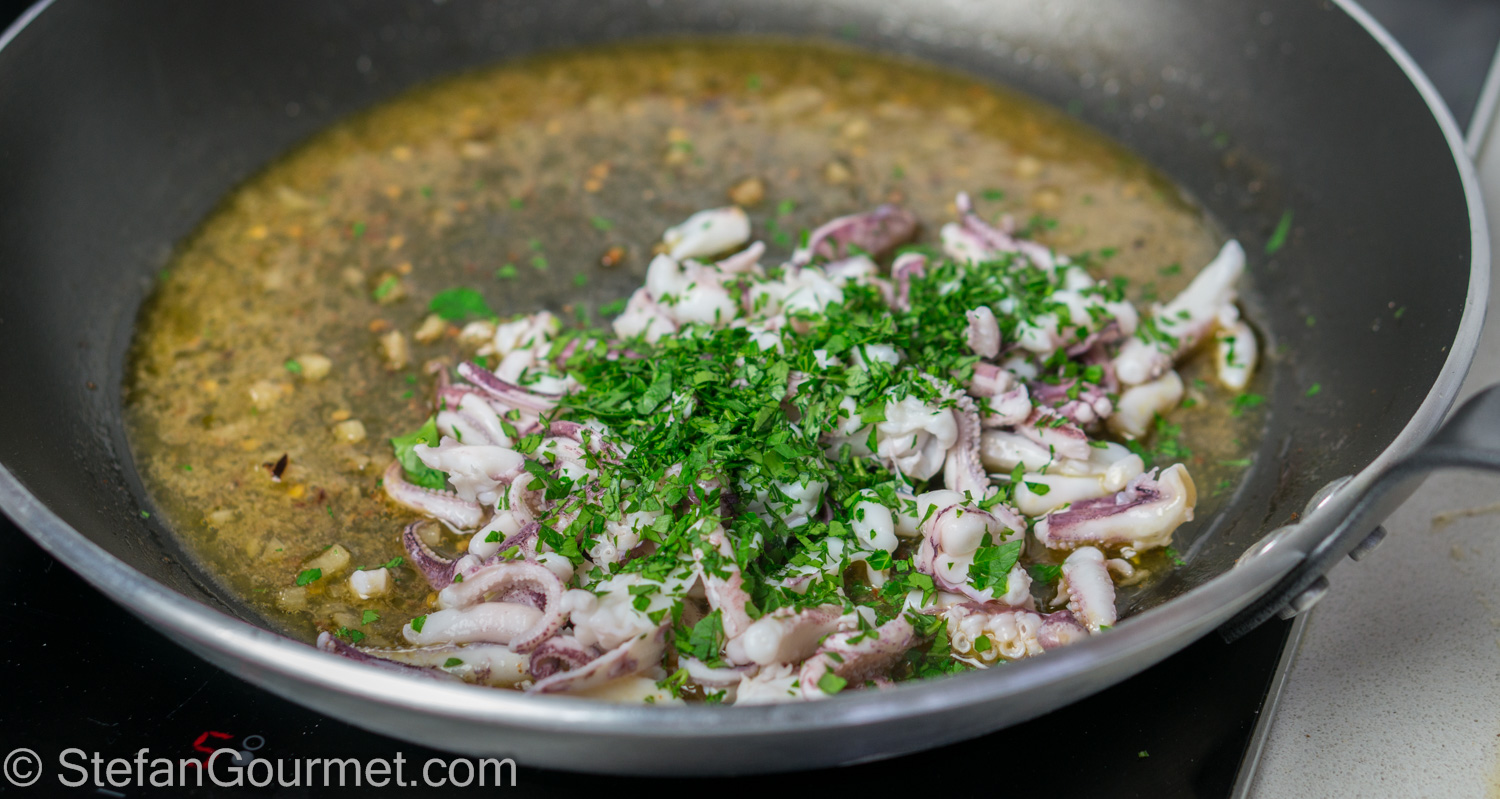 Drain the calamari tentacles. About 1 minute before the pasta is done, add the calamari and most of the parsley to the sauce. Season lightly with salt.