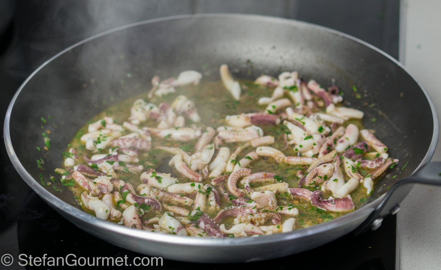 Cook for 30 seconds, not longer, and then remove the calamari with a strainer.