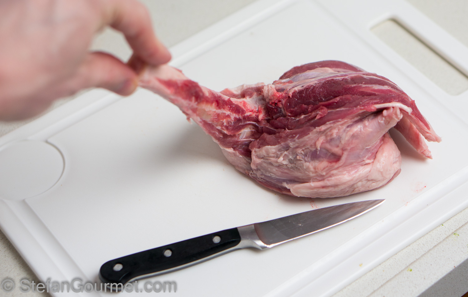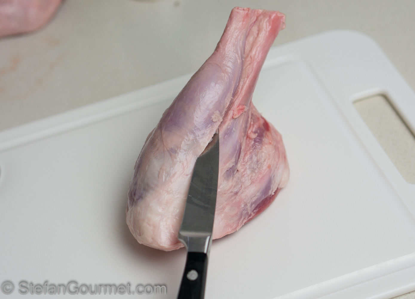 Use a small sharp (deboning) knife and start at the shin (where there is no meat, only skin on bone.