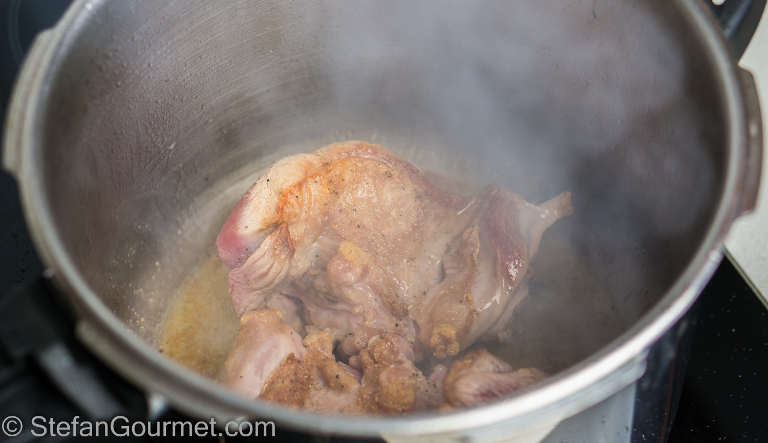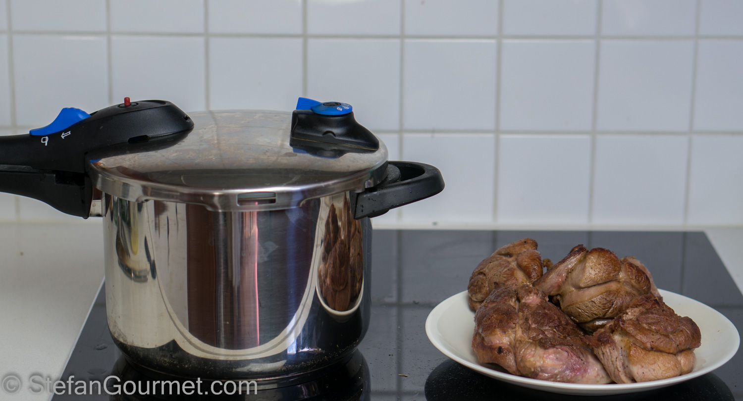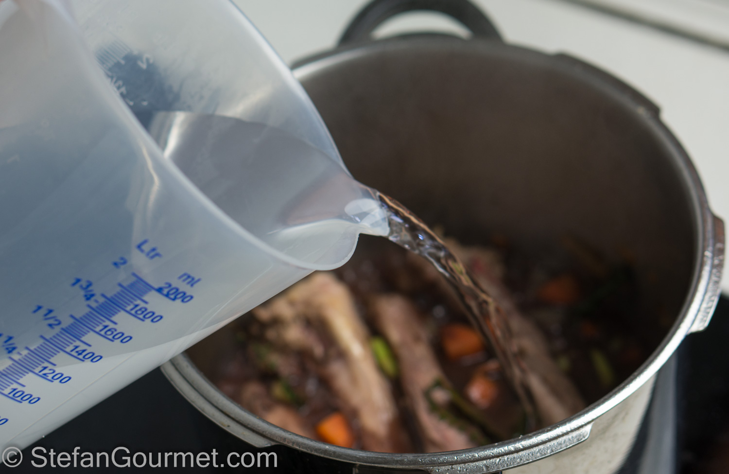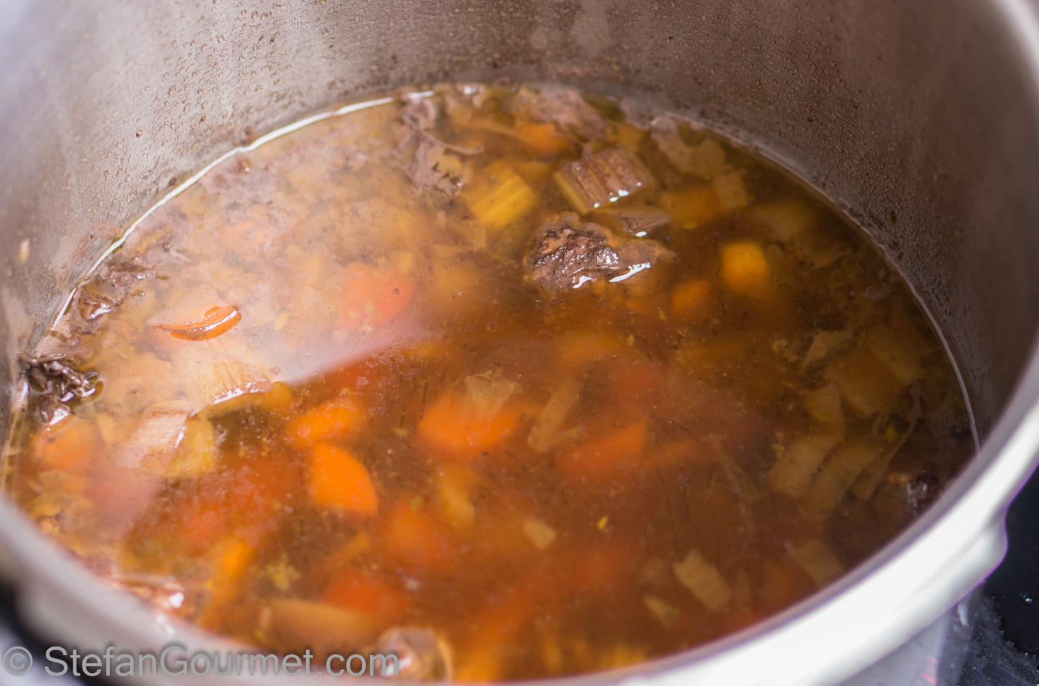 Pressure cook for 2 hours or simmer for 4 hours, while the meat is cooling off.