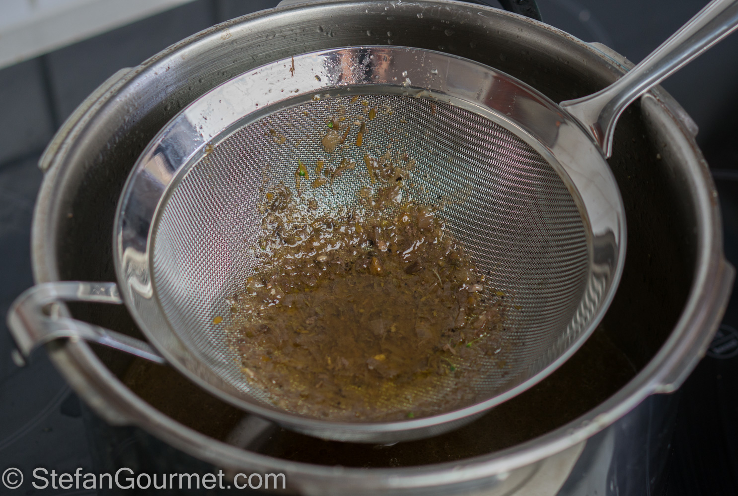 …and simmer until reduced to about 125 ml (1/2 cup). Allow to cool and remove the fat that will float on top.