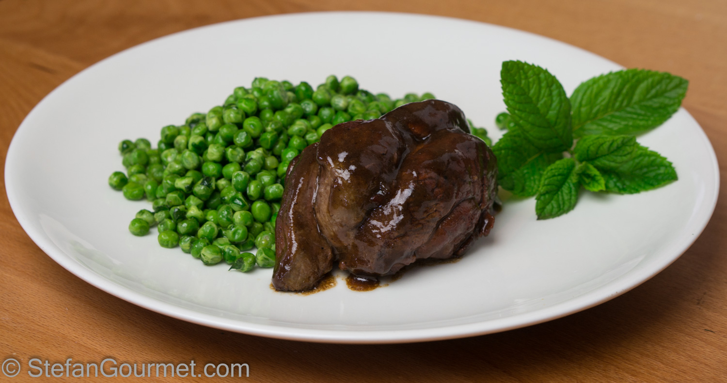 To make the peas, melt the butter in a saucepan and add the peas. Cook them until they are tender but still firm to the bite. When using fresh peas rather than frozen, you may need to add a bit of water. When the peas are cooked to your liking, season with salt.