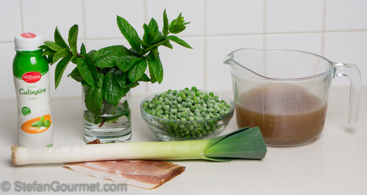 In the Netherlands, pea soup is a hearty winter soup made from dried peas and ham hock. Silva Rigobello reminded me that you can also make a lighter pea soup from fresh peas, perfect for spring. In this case, I paired the peas with fresh mint from my garden and with crispy ‘Speck’. Speck is the word from Tirol for cured and smoked ham. You could also use Schwarwalder Schinken or any other type of smoked cured ham. Such a smooth soup is called velouté because it is as smooth as velvet. The smooth sweet earthy pea soup works very well with the crispy salty smoky speck and the fresh mint. It is pretty easy to make and only takes about half an hour altogether. The recipe includes a simple way to make crispy speck or prosciutto. Here’s what I did…