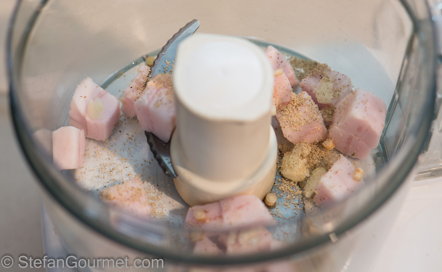 Combine 100 grams (3.5 oz) fat from pork belly with 1/2 tsp freshly ground white pepper, 1/2 Tbsp chopped garlic and 1/2 tsp chopped cilantro root in the bowl of a food processor or blender.