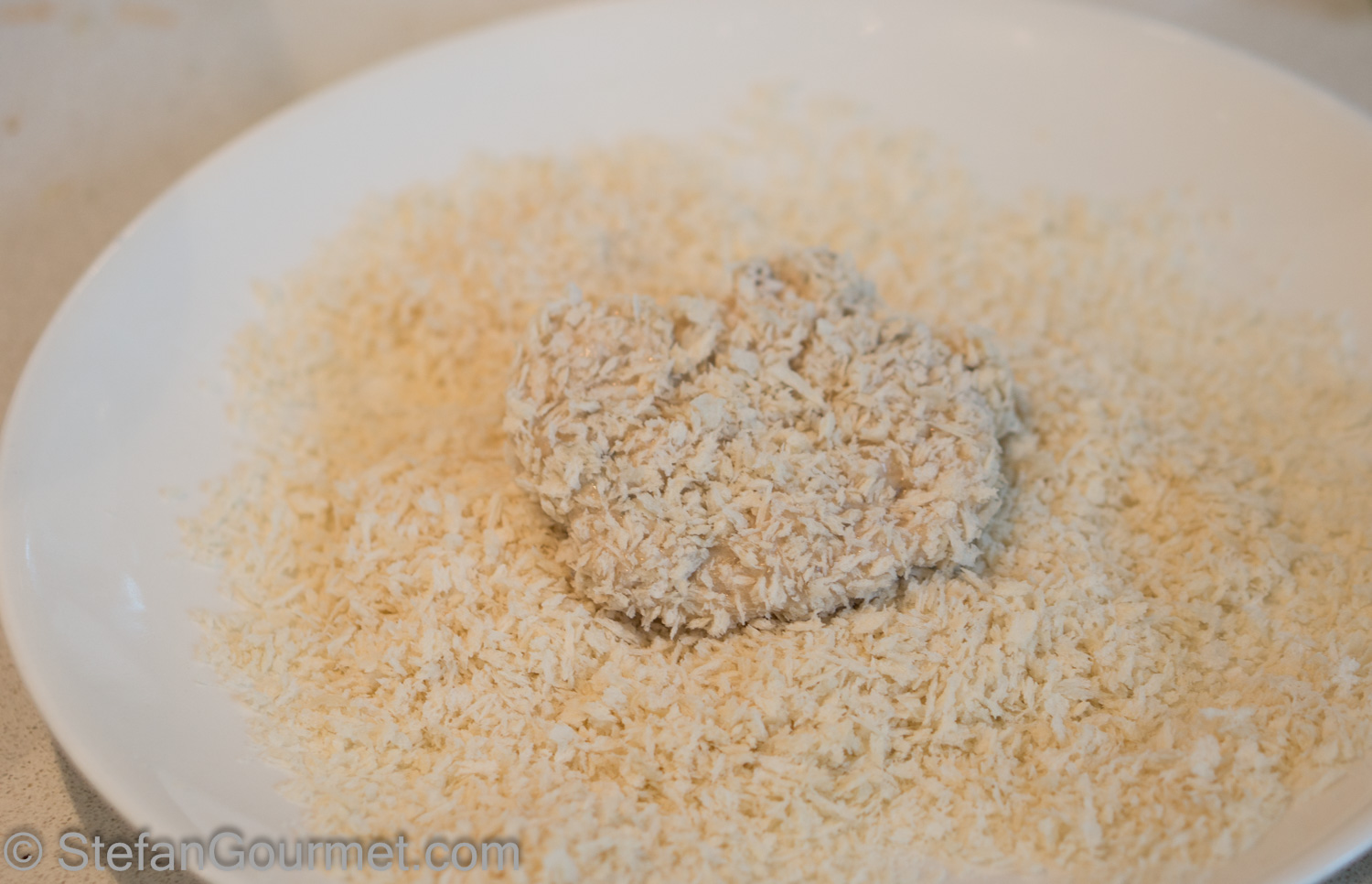 …and sprinkle panko on the top as well. Carefully lift the panko-covered uncooked shrimp cake with your hands. The mixture is not firm, but you can keep it in shape with your hands. Thanks to the panko, there are no sticking issues.