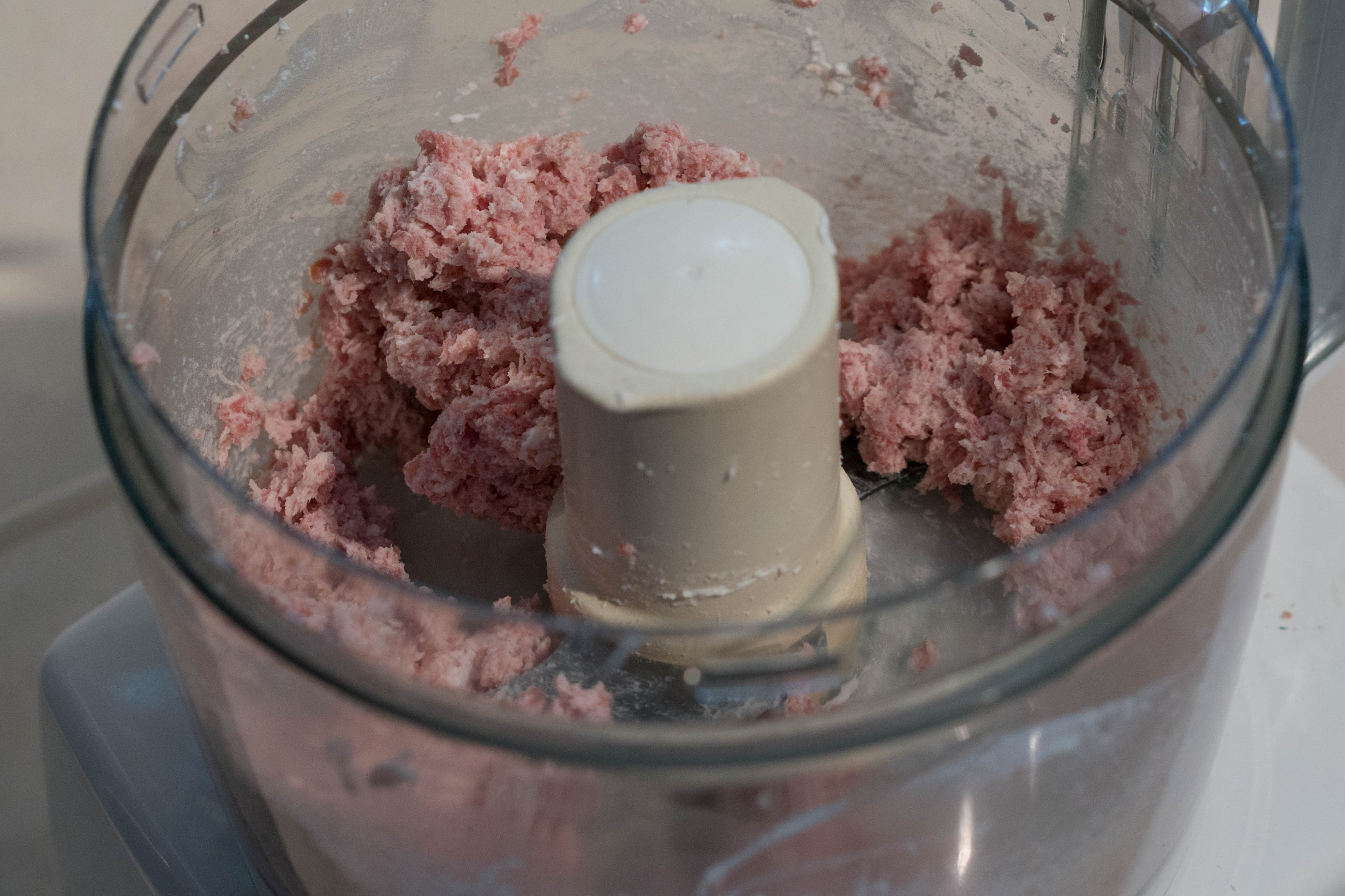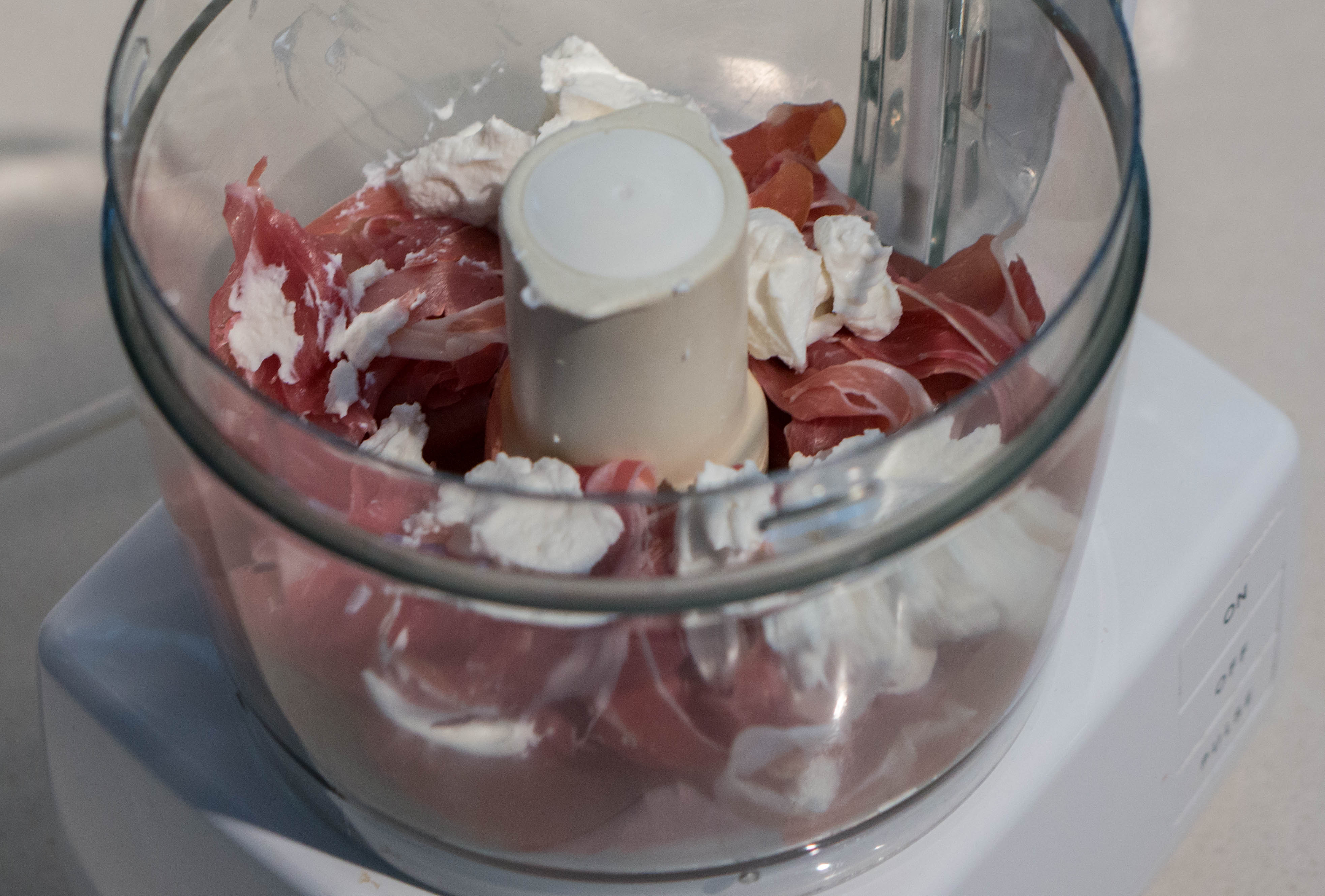 Combine 125 grams (4.5 oz) of prosciutto and 125 grams (1/2 cup) of ricotta cheese in the bowl of a food processor.