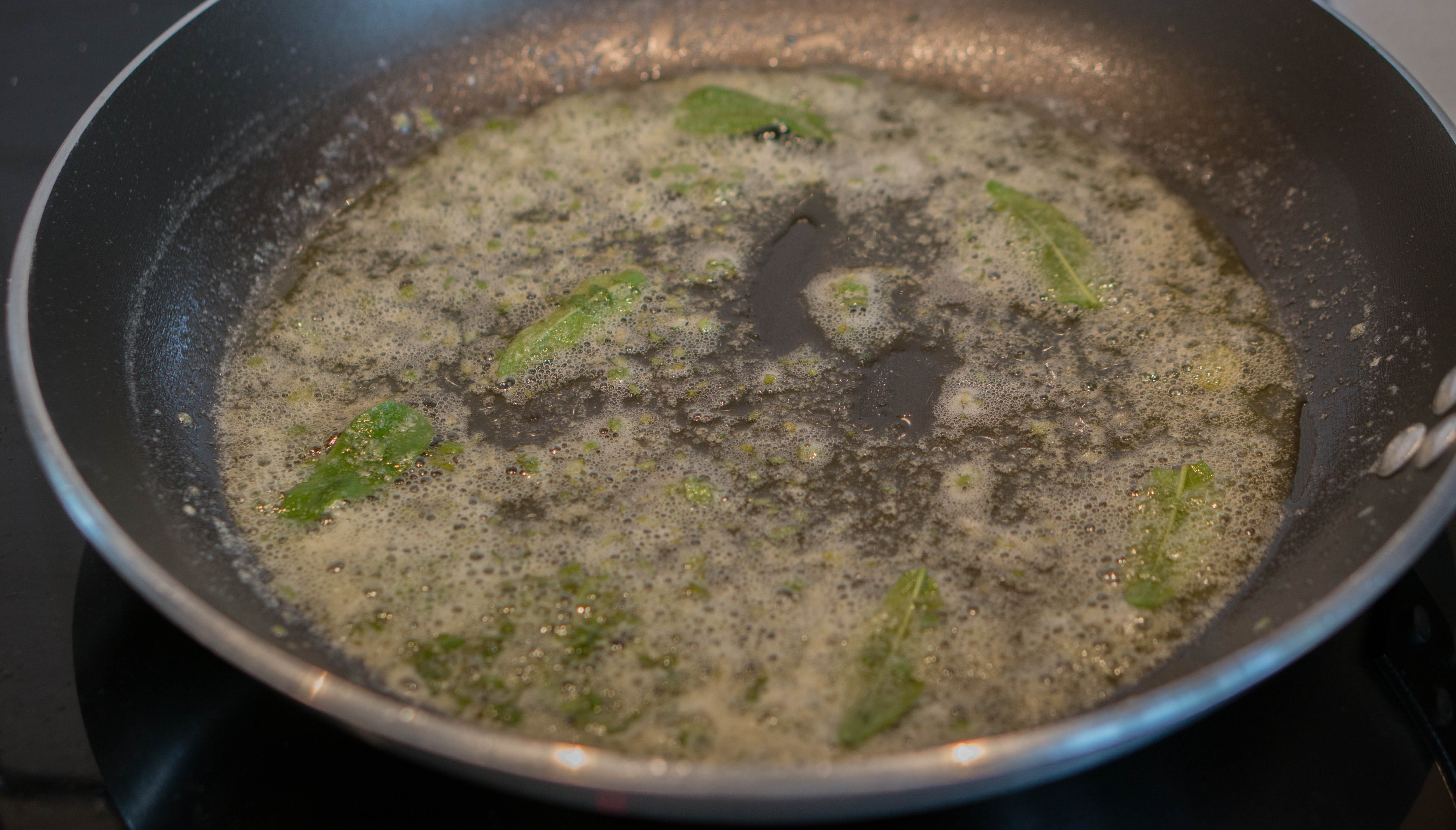 Bring a pot of water to a boil. Meanwhile, melt 50 grams (3 1/2 Tbsp) of butter in a frying pan and add some fresh sage (minced and/or whole) and stir for a minute.
