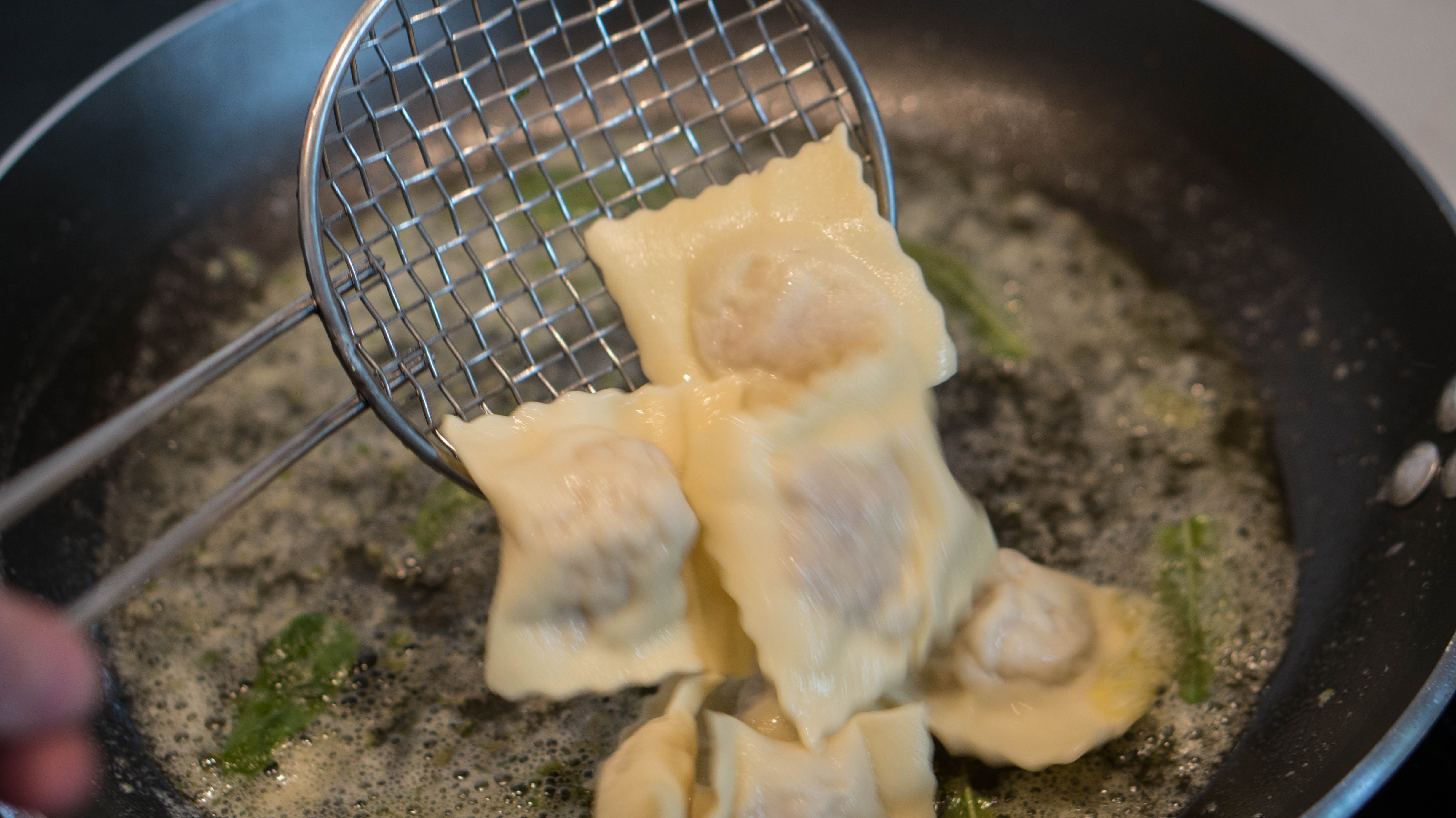 When the water boils, add salt and the ravioli. Cook them for about 3 minutes, then transfer them to the butter and sage with a strainer.