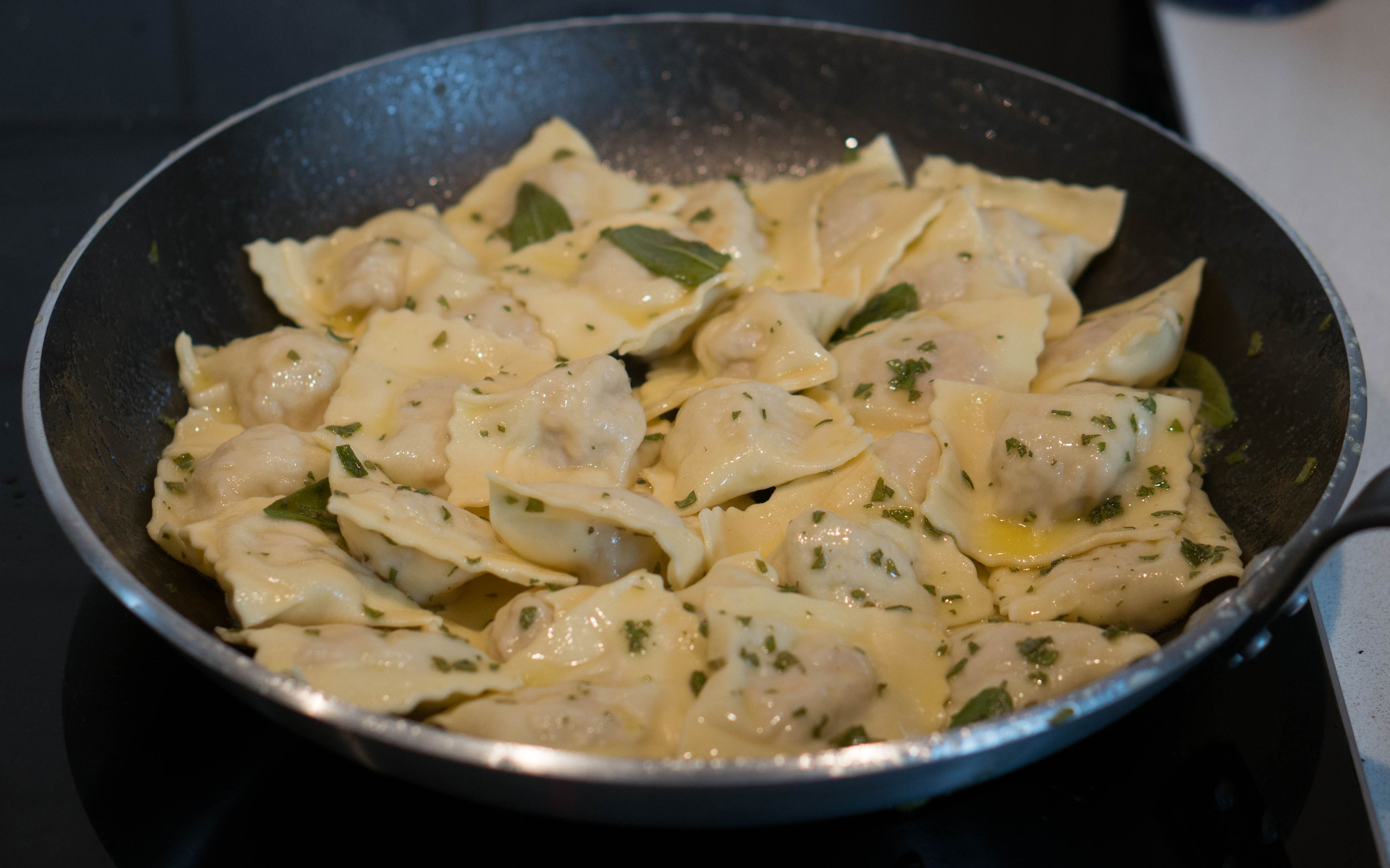 Once you’ve fished out all of the ravioli, toss them gently until they are covered all over with butter and sage.