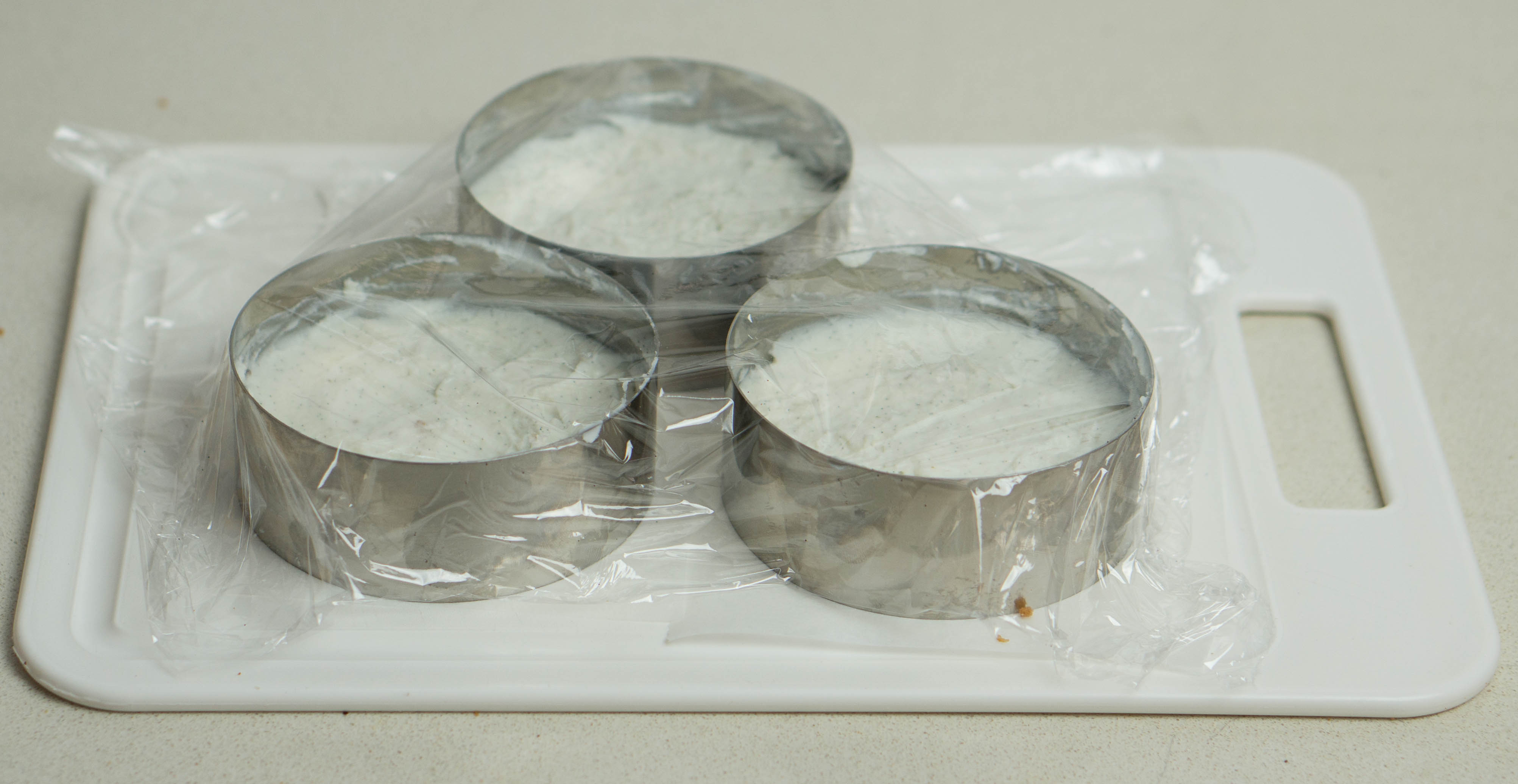 Line a tray or thin cutting board with parchment paper, and arrange 3 ring molds (10 cm/4 inch) on top. Divide the amaretti mixture between them, and use a spoon to flatten and compact the crust within each mold.