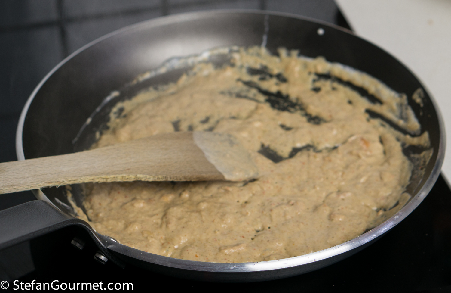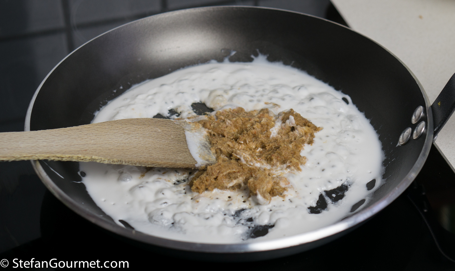 Heat the coconut cream, and then add the curry paste.