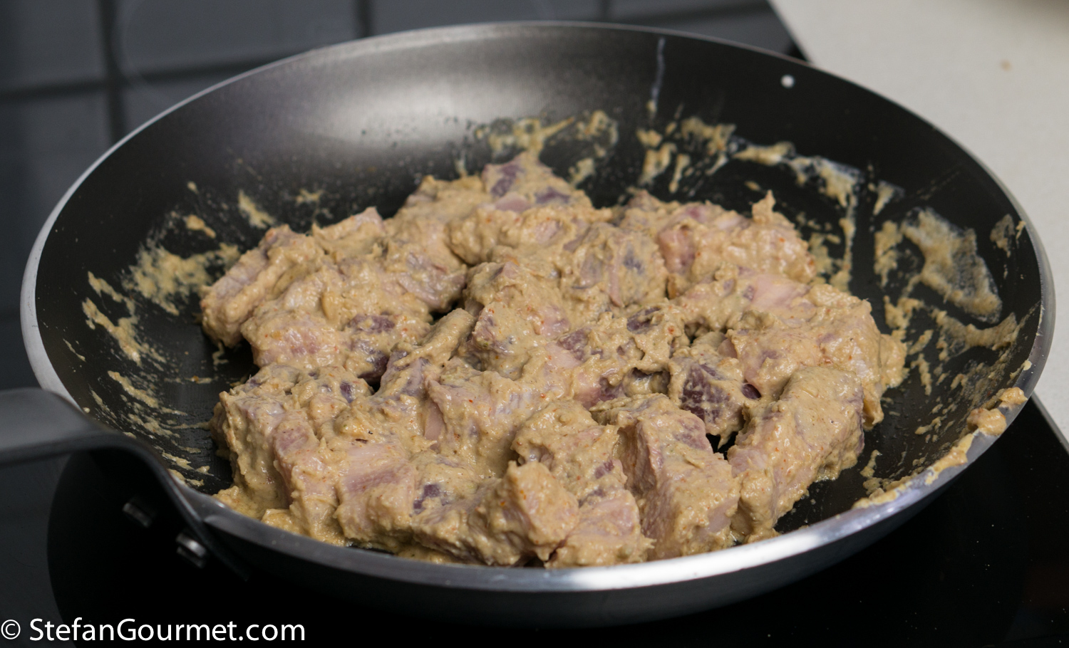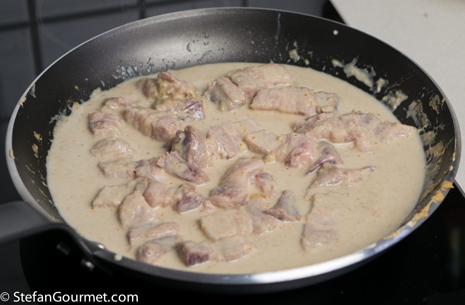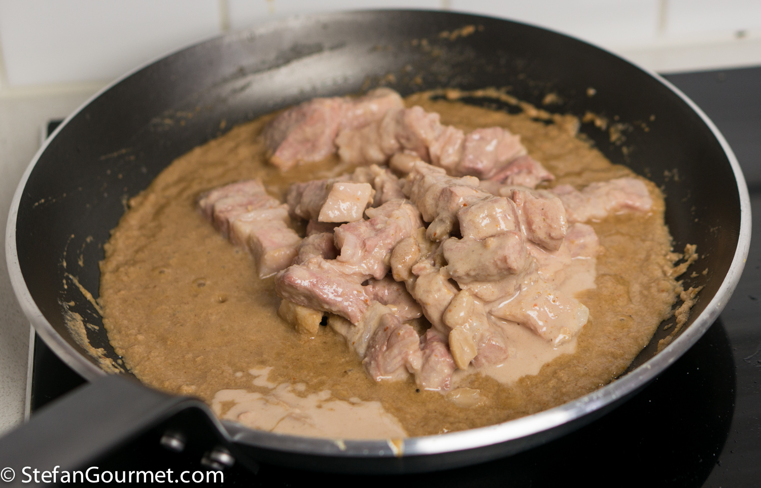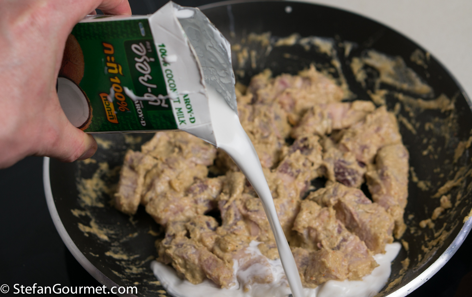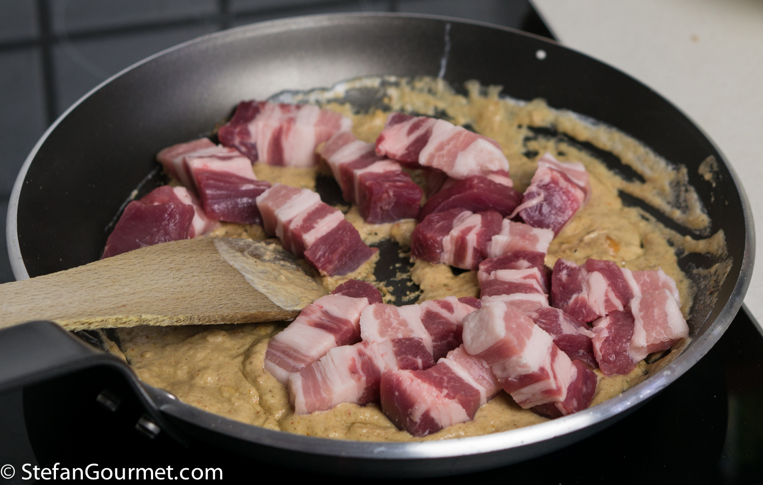 …and stir until the pork belly is coated by the curry paste. Then turn off the heat.