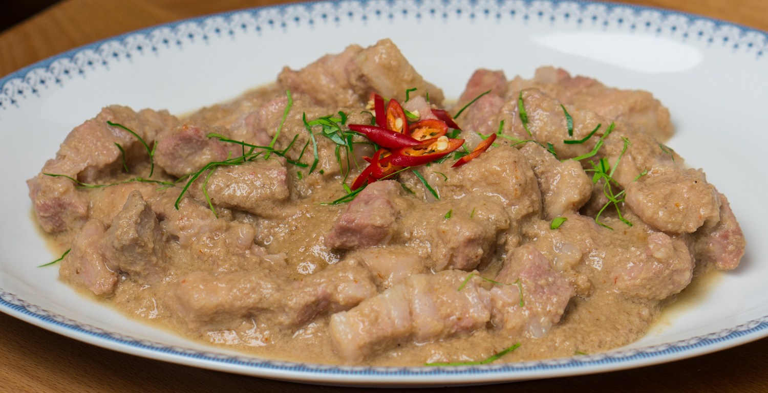 Panang is a Thai curry made with meat and red curry paste enriched with peanuts, cumin, and coriander. It does not contain vegetables, except that it is garnished with chiffonaded kaffir lime leaves and thinly sliced red chilli peppers. I’ve posted about Chicken Panang before, based on a recipe by the High Heel Gourmet. This time around, I thought it would be fun to experiment with thai curry sous-vide. And so I made a Panang Curry with pork belly cooked sous-vide. The result was great: the pork belly was very tender and juicy, and the long cooking time allowed the curry flavor to penetrate into the meat.